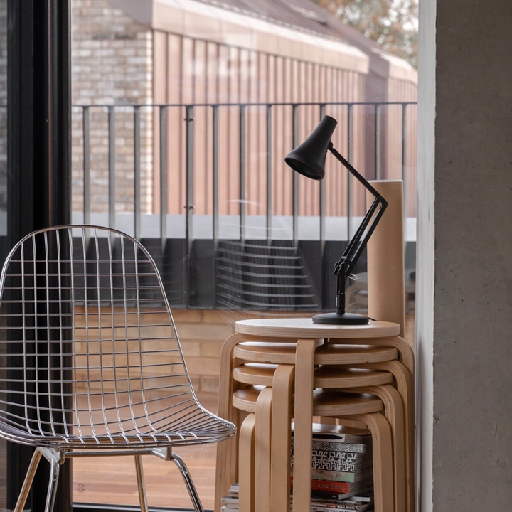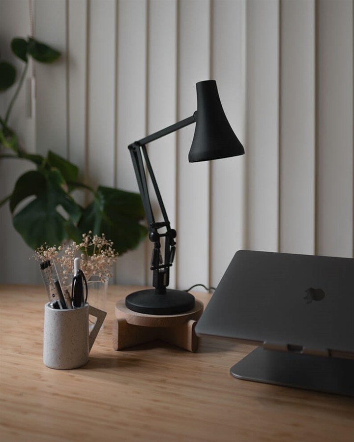 90 Mini Mini bordlampen i kulsort med finish i anodiseret børstet aluminium har et yderst funktionelt design, hvor lampen kan roteres 360 grader ved skærmen og bordfoden. Den unikke bordlampe benytter et USB-A kabel, som medfølger. Derfor kan man nemt tilslutte lampen til f.eks. sin computers USB-A port for at få lys til hjemmearbejdet eller for at kunne nærstudere en opskrift i køkkenet.