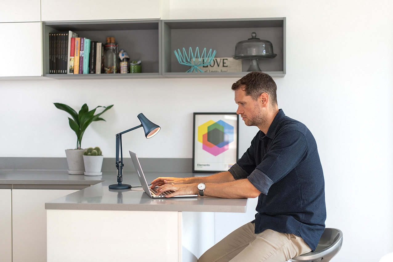 90 Mini Mini bordlampen i stålblå med finish i anodiseret børstet aluminium har et yderst funktionelt design, hvor lampen kan roteres 360 grader ved skærmen og bordfoden. Den unikke bordlampe benytter et USB-A kabel, som medfølger. Derfor kan man nemt tilslutte lampen til f.eks. sin computers USB-A port for at få lys til hjemmearbejdet eller for at kunne nærstudere en opskrift i køkkenet.