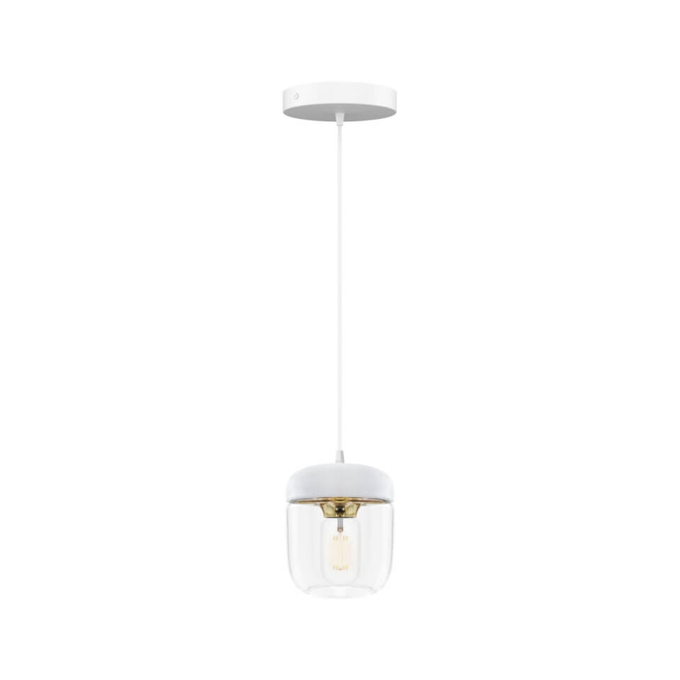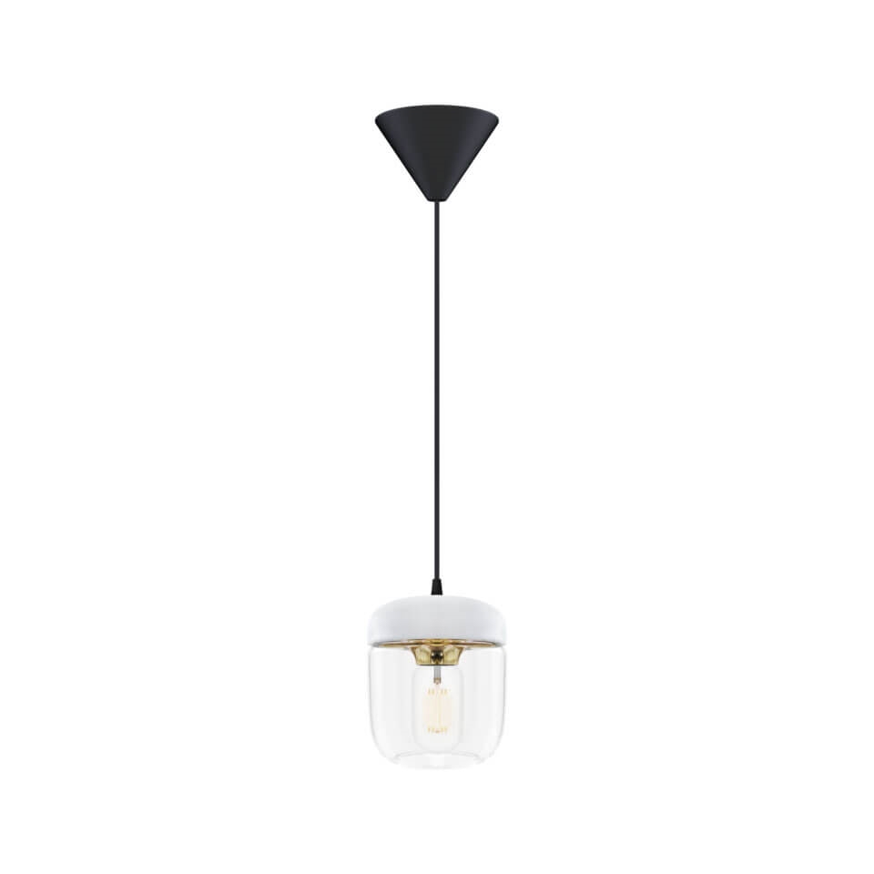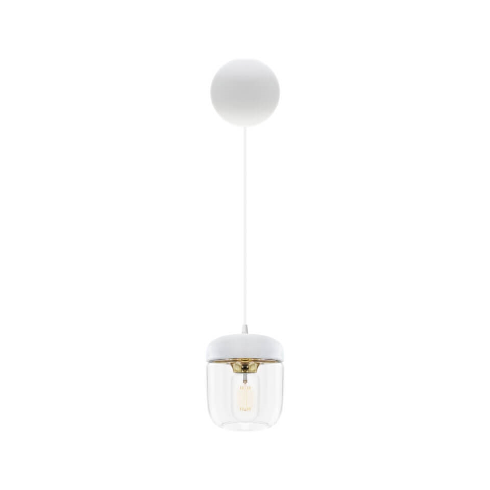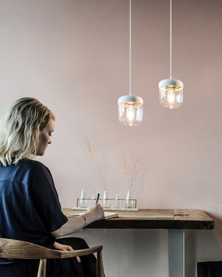 Acorn skal kombineres med et ophæng, som købes særskilt. Vælg eksempelvis mellem E27-ophængene Cannonball, Cannonball Cluster 2 og 3, Cord Set, Cord Set Pro eller Rosette fra Umage.