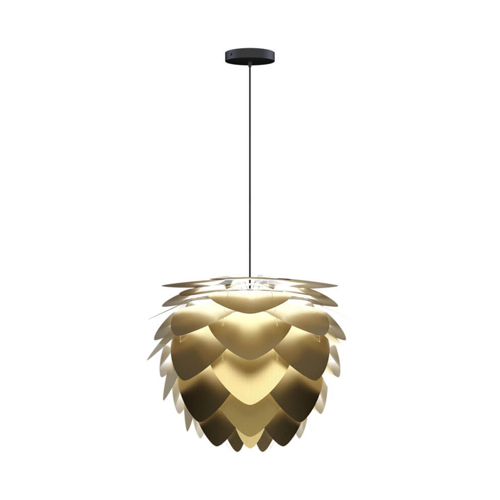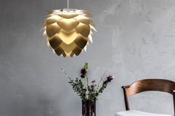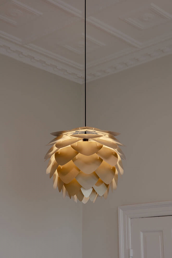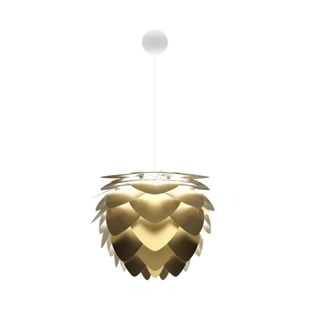Aluvia medium skal kombineres med et ophæng, som købes særskilt. Vælg eksempelvis mellem E27-ophængene Cannonball, Cannonball Cluster 2 og 3, Cord Set, Cord Set Pro eller Rosette fra Umage. Vægophængene Willow single eller double fra Umage passer også til Aluvia medium.