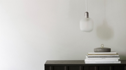 Pendel med hvidt glas har 4 m tekstilledning med hvid loft baldakin.