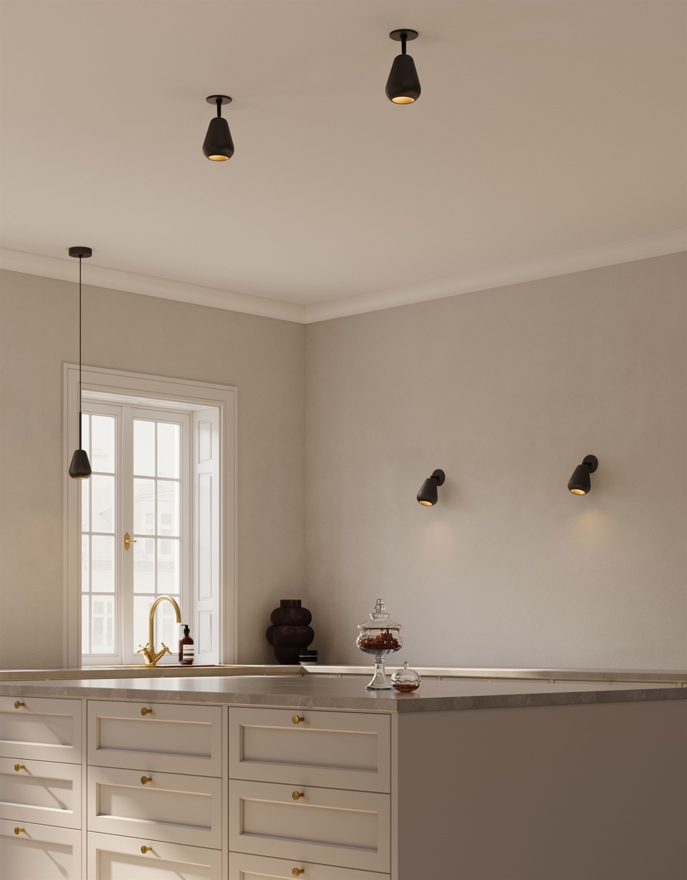 Spottet findes udover i sort også i en kombination af nordic guld og hvid og i samme farver som spot til påbygning i loft eller væg.