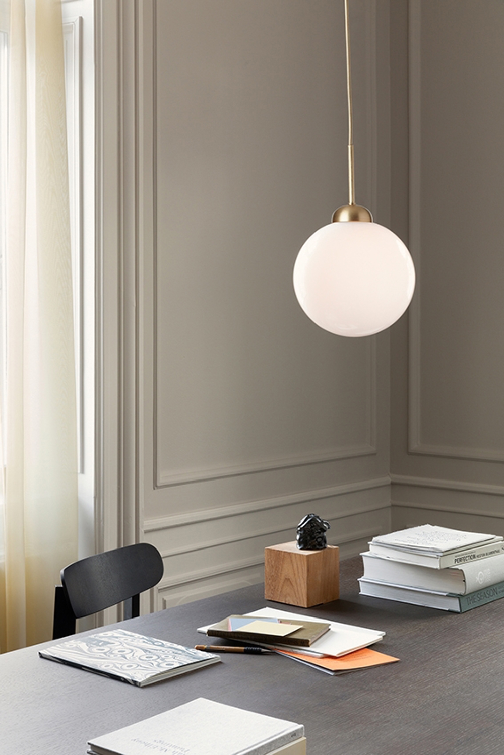 Apiales 1 large pendlen består af én mundblæst opal glaskuppel samt satin sort detaljer. Den fine pendel giver et klassisk udtryk til rummet uden at forstyrre andre elementer i rummet.