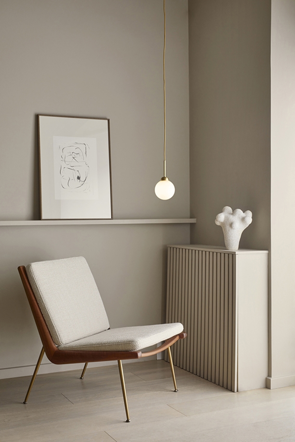 Apiales 1 pendlen består af én mundblæst opal glaskuppel samt børstet messing detaljer. Den fine pendel giver et klassisk udtryk til rummet uden at forstyrre andre elementer i rummet.