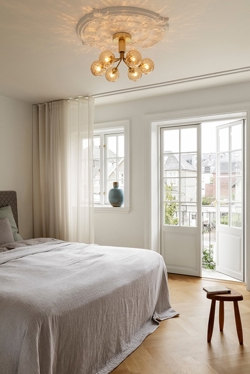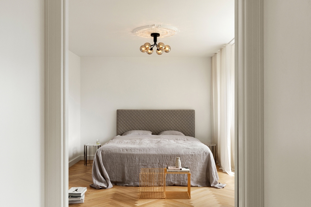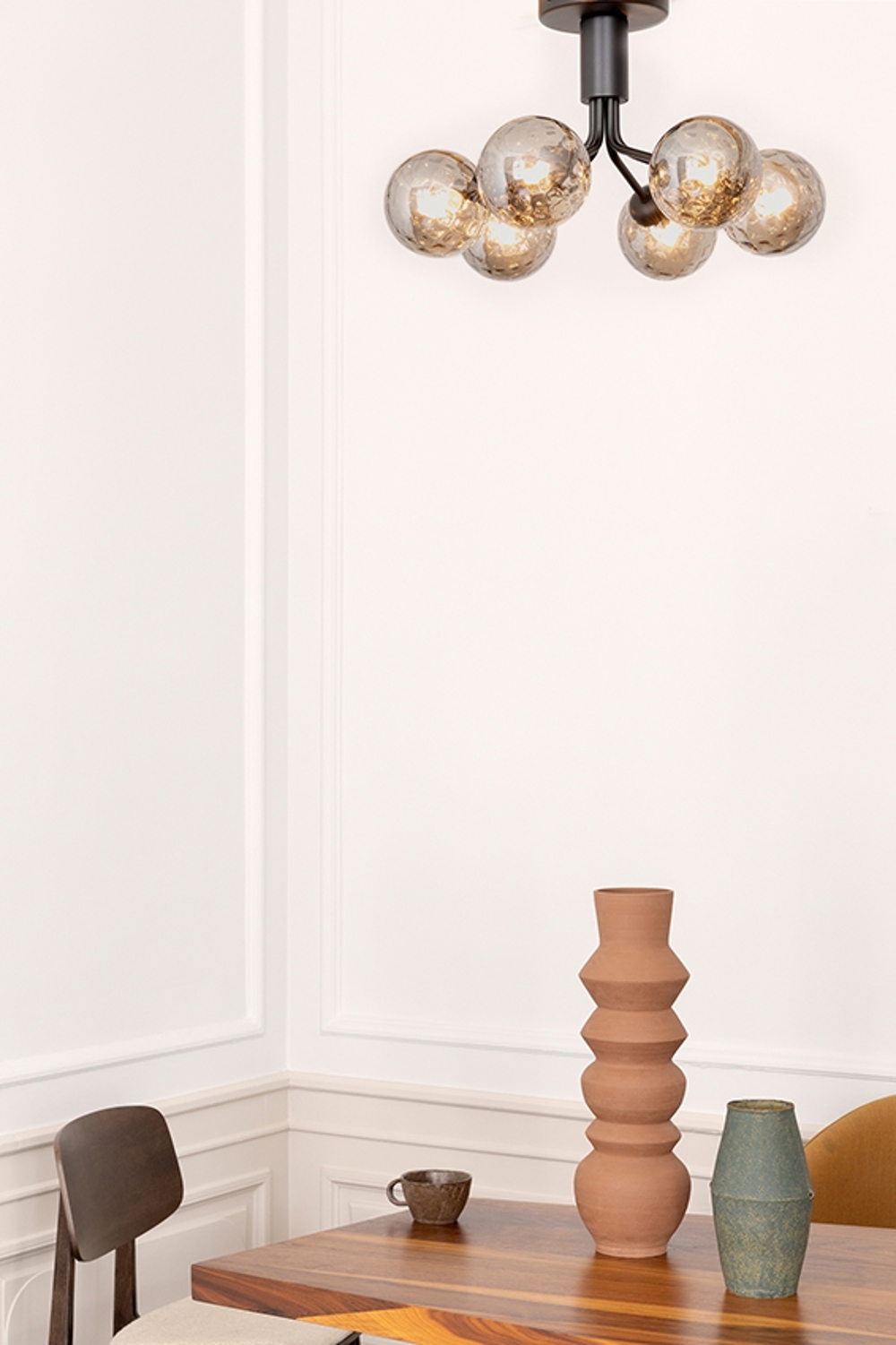Apiales 6 loftlampe monteres direkte i loftet og har en lav højde på 29 cm. Det giver lampen en stor anvendelighed - og gør det nu muligt at have en loftlampe/lysekrone, hvor der er lavt til loftet eller i gennemgangsrum.
