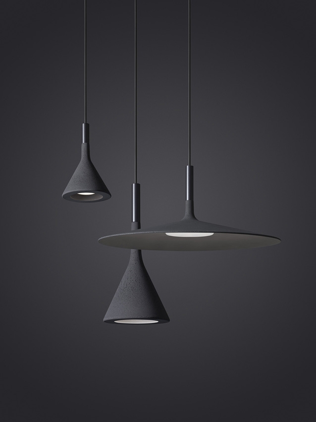 Foscarini Aplomb pendlen fås i flere forskellige farver; grå cement i sin rå tilstand, en stilfuld hvid nuance, en varm, intens brun og nu også i antrasit.