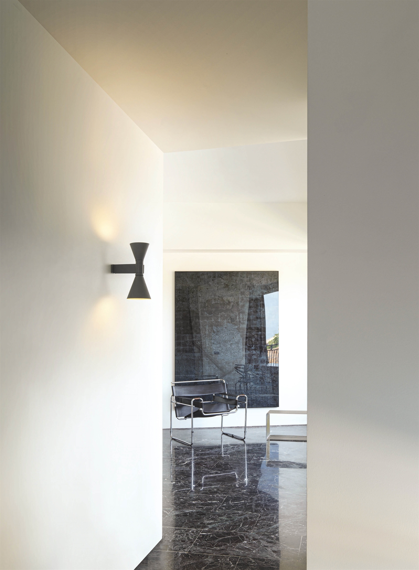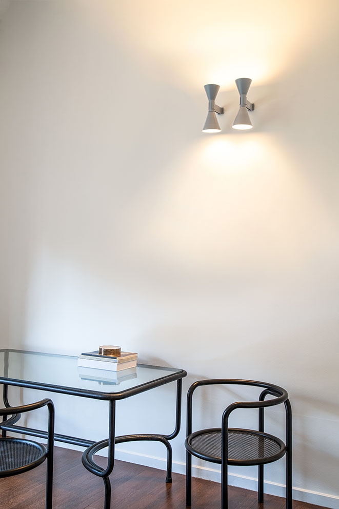 væglampen er designet i aluminium og findes i hvid, grå og sort. Lampens to kegleformede skærme giver et smart udtryk og orienterer lyset opad og nedad og skaber en ensartet lysstråler. Perfekt ved sofaområdet eller som læselampe ved sengen.