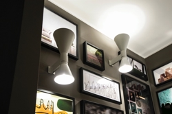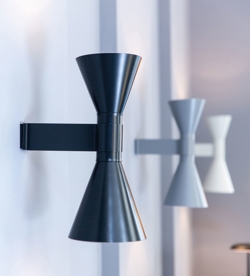 væglampen er designet i aluminium og fås i hvid, sort eller grå. Lampens to kegleformede skærme giver mulighed for at dække to behov med én lampe. Applique de Marseille væglampen har et smukt lys og et smart udtryk og vil passer godt ved sofaområdet eller som læselampe ved sengen.