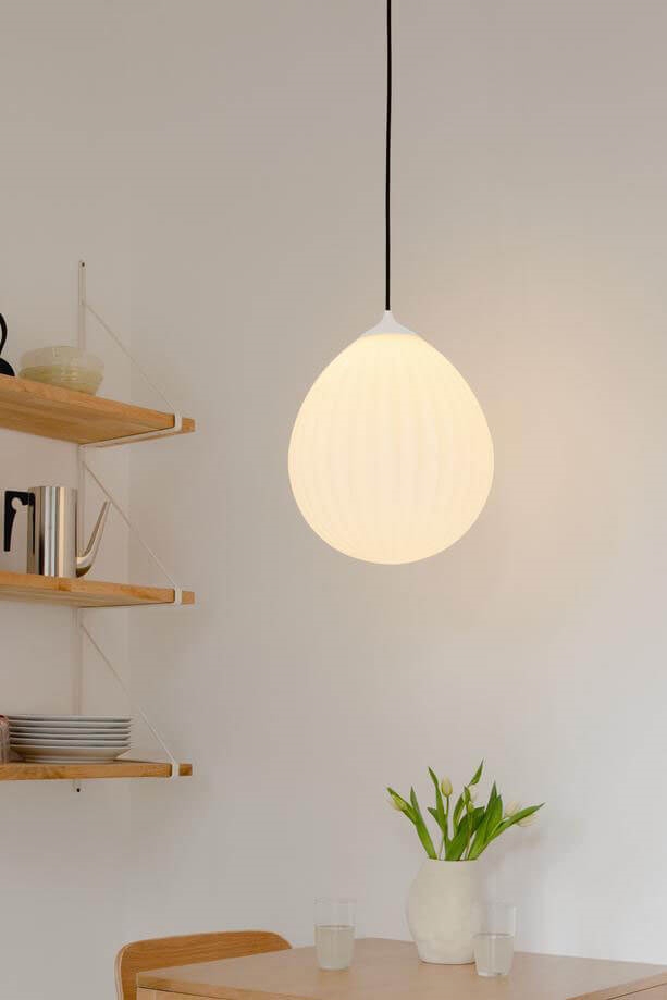 Lampeskærmen skal kombineres med et ophæng, som købes særskilt. Vælg eksempelvis E27-ophænget Cord Set Pro fra Umage, der er designet til skærmes vægt på 2,8 kg.