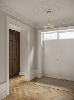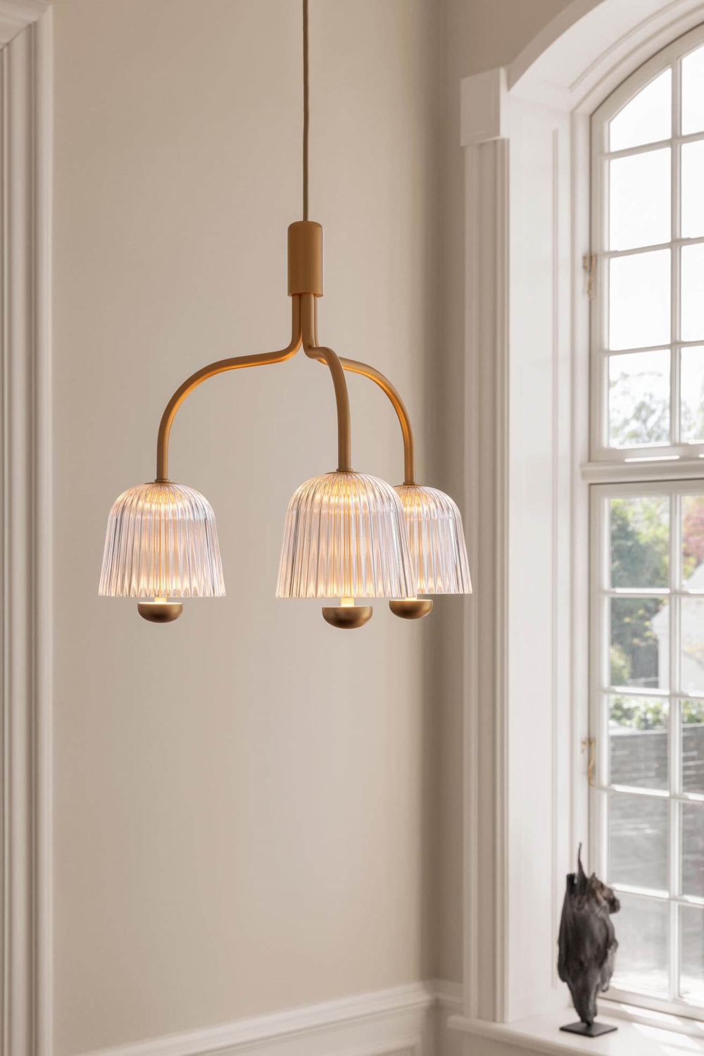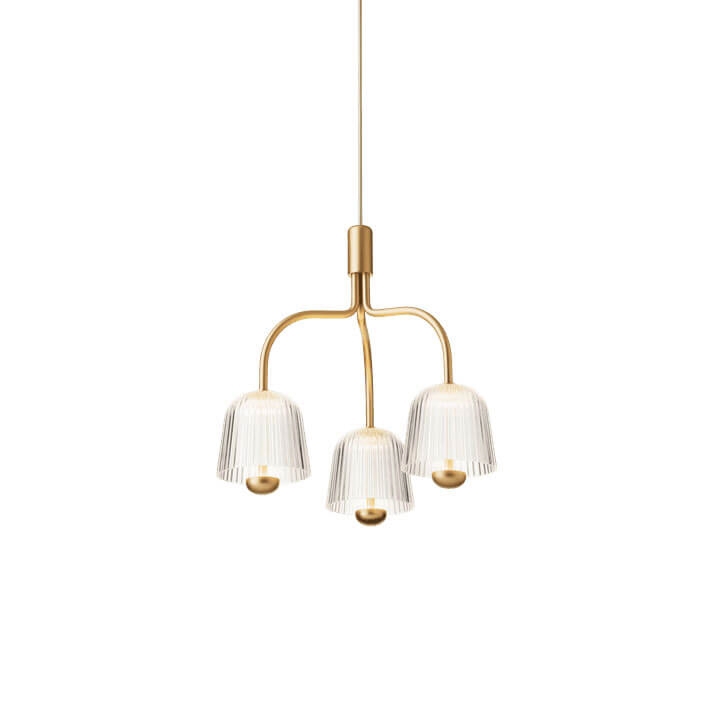 Lysekronen Asteea 3 er den klassiske lysekrone i en moderne fortolkning med et tidløst og eksklusivt design. De tre klokkeformede akrylskærme på buede arme med finish i satin messing sikrer en blød og blændfri belysning. De klare skærmes rillede struktur bidrager med et levende spil mellem lys og skygge.