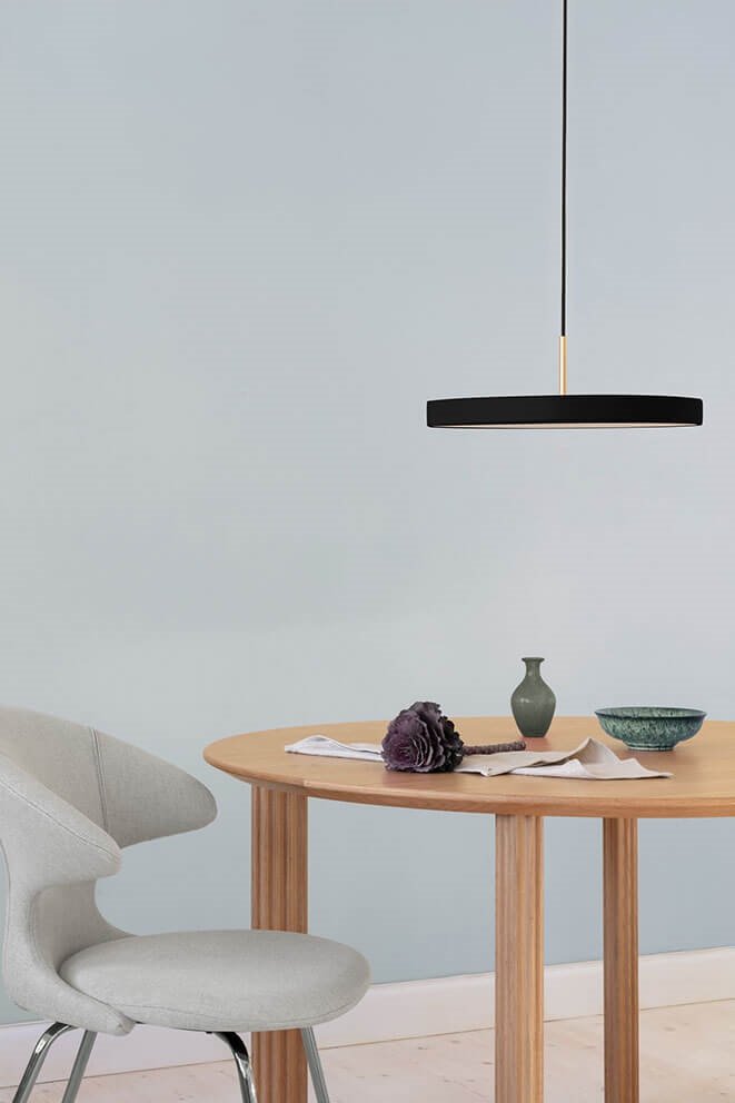 Asteria medium pendlen udsender et blødt lys fra den integrerede LED-lyskilde. Den populære lampe har et minimalistisk design med et enkelt og tidløst udtryk. Pendlens slanke og elegante form gør lampen til et oplagt valg til køkkenområder, som lampe over spisebordet eller som belysning i soveværelset, entréen eller stuen.