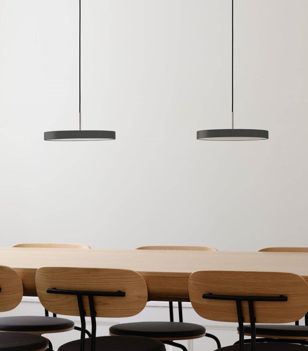 Asteria Plus mini er en variant af den populære Asteria pendel, der har fået indbygget lysdæmper og mulighed for montering i lysskinne. De ekstra muligheder med Asteria Plus øger fleksibiliteten og gør sammen med det elegante minimalistiske design lampen til et oplagt valg til både kontorbelysning, køkkenområder eller lampe over spisebordet.