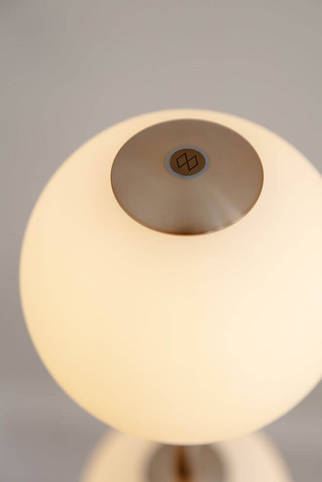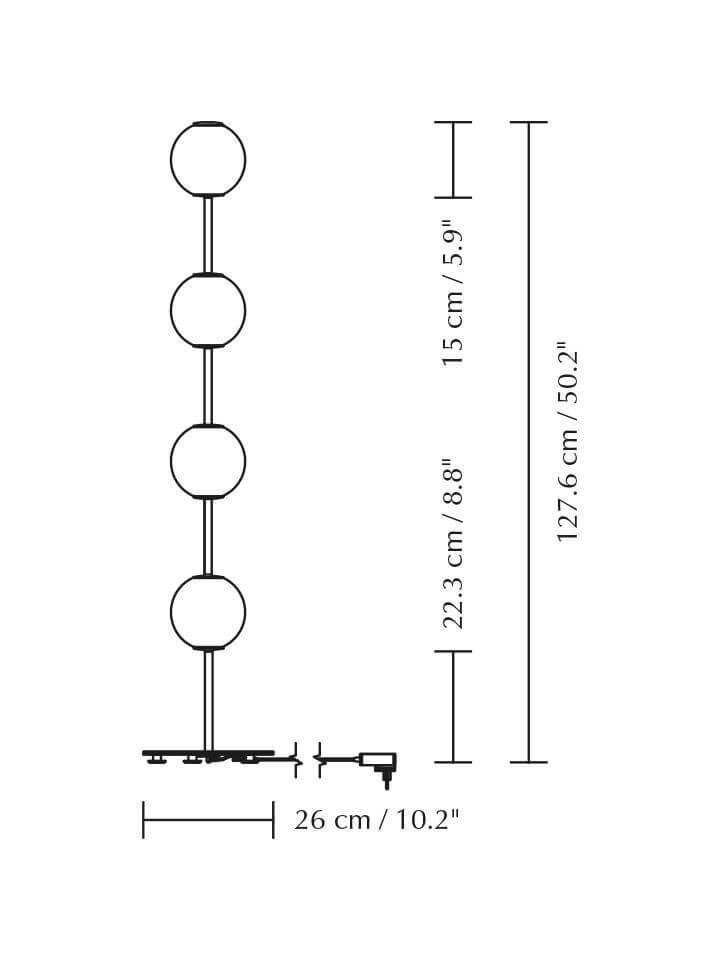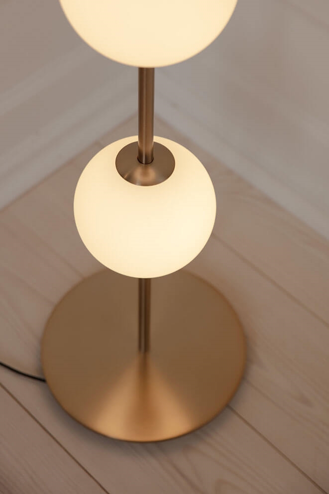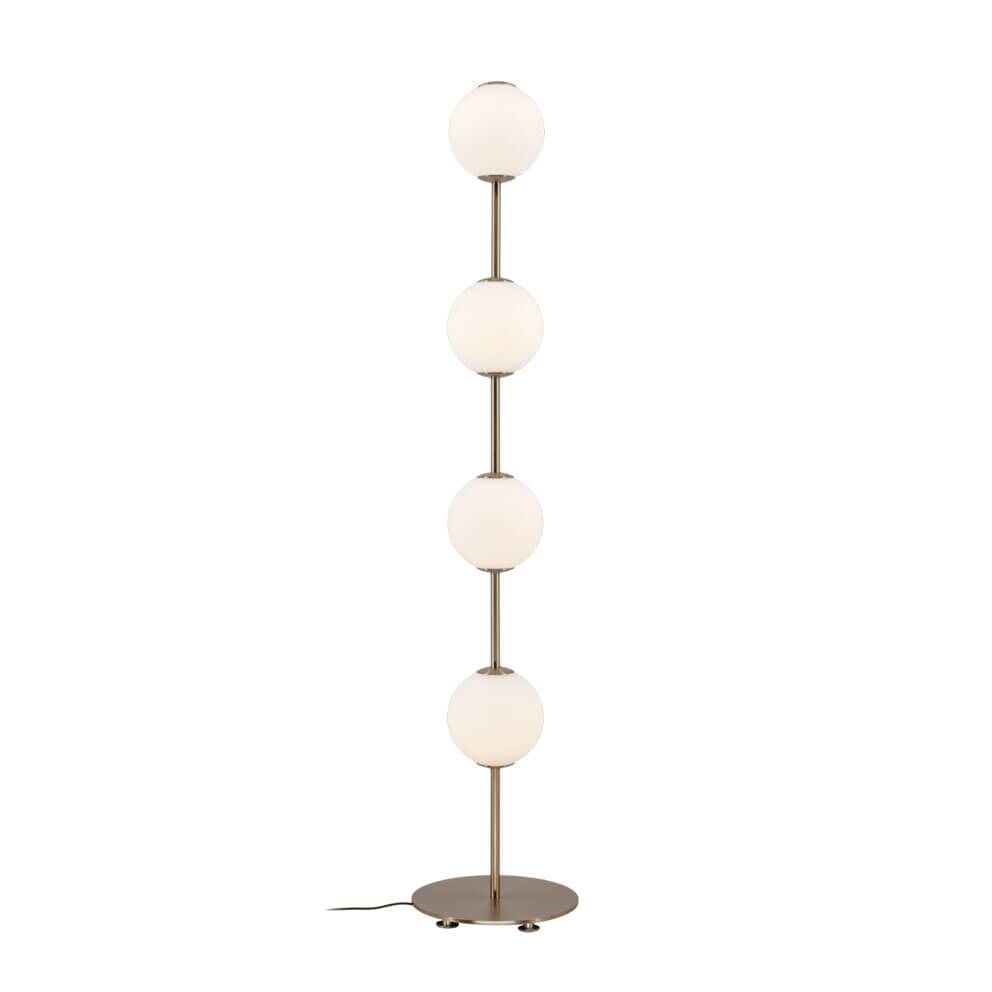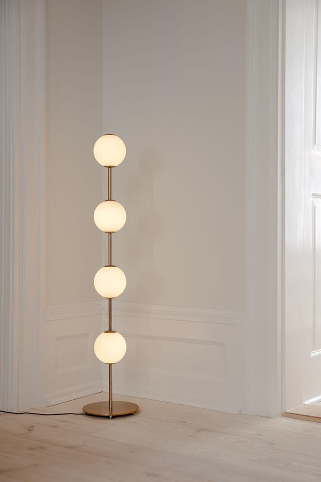 Gulvlampen Audrey har messingdetaljer og fire mundblæst kugleformede skærme i opalglas, der leder tankerne hen på en række elegante lysnede perler. Lampen udsender et blødt og behageligt lys og vil være en sofistikeret tilføjelse til enhver indretning. Benyt eksempelvis Audrey som belysning i stuen eller indbydende lys i entréen.