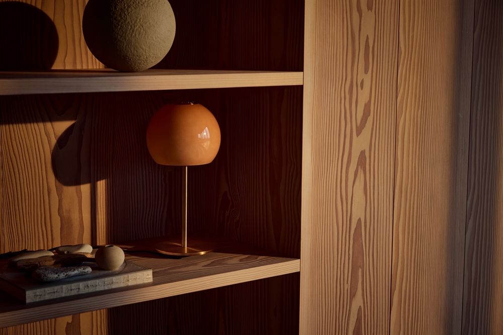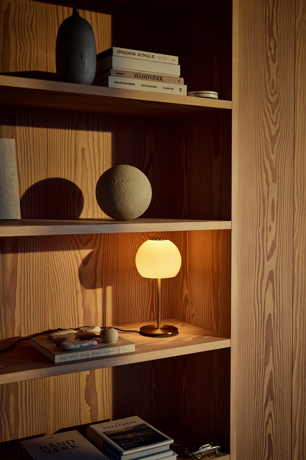 Med bordlampen Ball Glass lanceret i 2026 får det enkle og tidløse design en ekstra dimension, der tilfører varme og atmosfære til indretningen med ravfarvet eller sandgrå glas. Sammen med en perforeret metalplade på toppen tilføjer brugen af glas en moderne æstetik til Benny Frandsens ikoniske Ball-design.