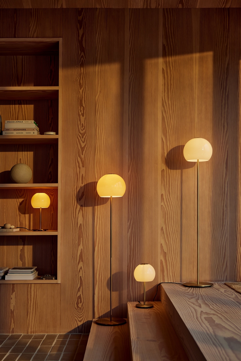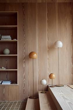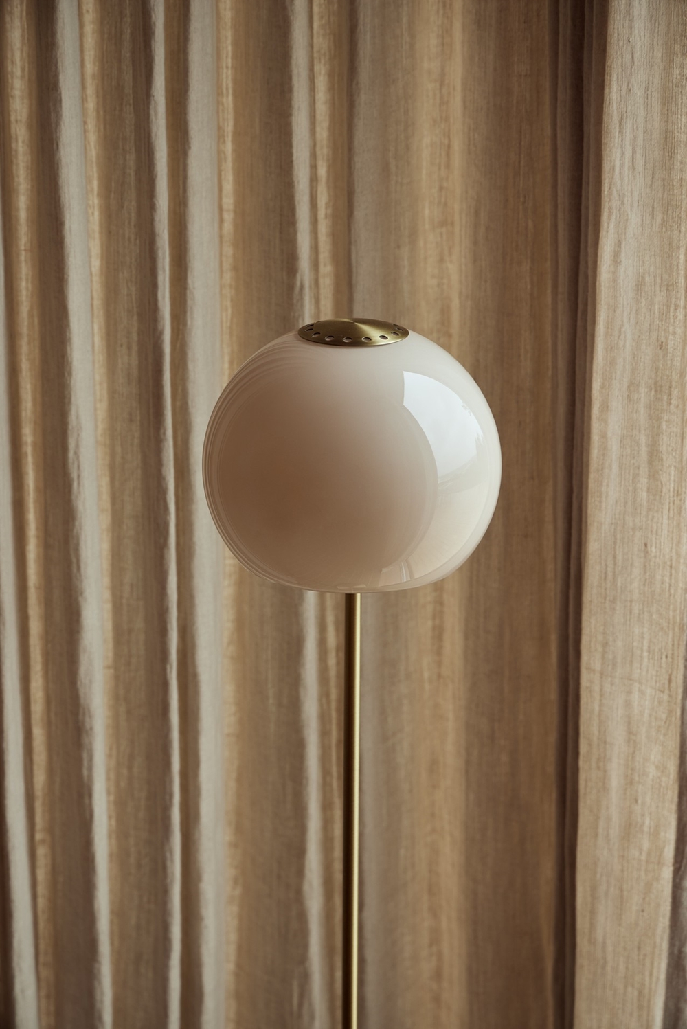 Med gulvlampen Ball Glass lanceret i 2026 får det enkle og tidløse design en ekstra dimension, der tilfører varme og atmosfære til indretningen med ravfarvet eller sandgrå glas. Sammen med en perforeret metalplade på toppen tilføjer brugen af glas en moderne æstetik til Benny Frandsens ikoniske Ball-design.