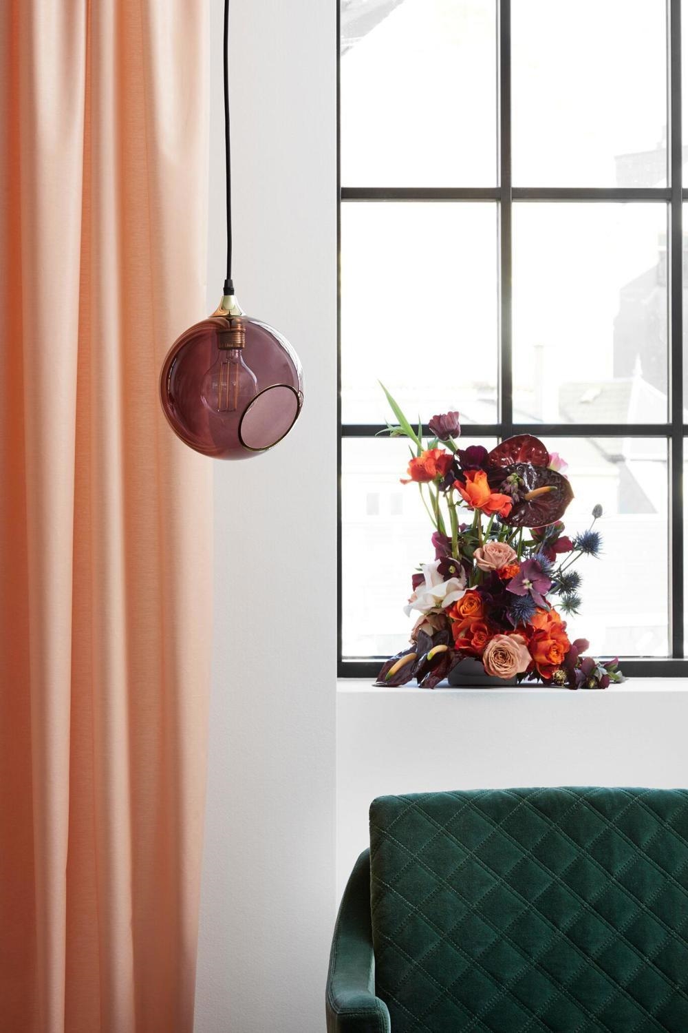 Materialet er mundblæst og håndmalet glas med sort stofledning.