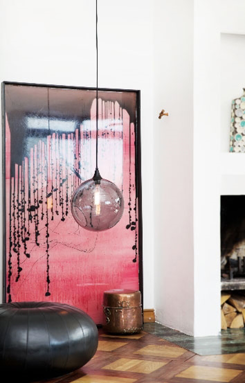 Materialet er mundblæst og håndmalet glas med sort stofledning.