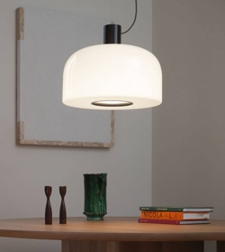 Bellhop Glas pendlen findes i to størrelser og udover med top i cioko også med top i hvid eller bright aluminium. Der er også loftlampe og bordlampe i lampeserien.