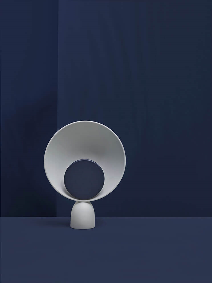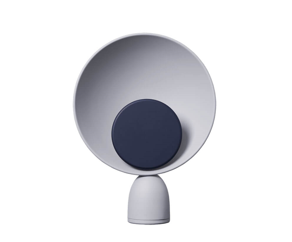 Bordlampen Blooper reflekterer blødt lyset fra lampens hule askegrå skive, der omslutter den karakteristiske mindre lysdæmperskive i marineblå. Den lille skive fungerer både som kontakt og lysdæmper, når den drejes for at tænde eller slukke lampen eller for at justere lampens lysstyrke.