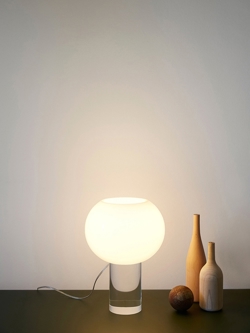 I Buds serien er det blæst glas kombineret med en gennemsigtig base, der kendetegner denne smukke bordlampe. Buds 3 er den mindste i Buds serien. Farvenuancen på Buds skifter alt efter om den er tændt, hvor den får en varm tone, og om den er slukket, hvor farvetonen bliver lidt koldere.