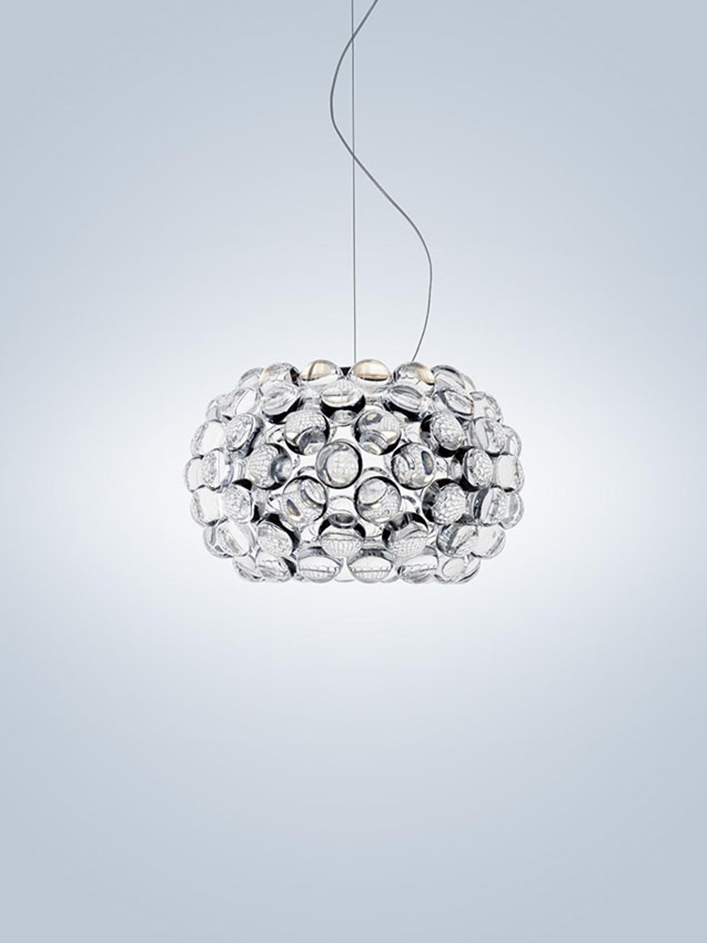 Skærmen på Caboche Plus Piccola pendlen består af kugler i akrylplast. Det specielle design giver en fantastisk mosaisk lysbrydning, som forstærker lyset fra den centrale lyskilde.