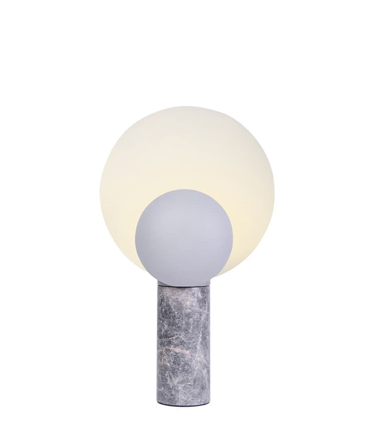 Caché bordlampen har et spændende og iøjnefaldende design. Lampen er lavet af to runde skærme, der elegant forenes af en solid marmorbase. Caché skaber en interessant og legende stemning, hvor lyset reflekteres frem og tilbage mellem de to nuancer.