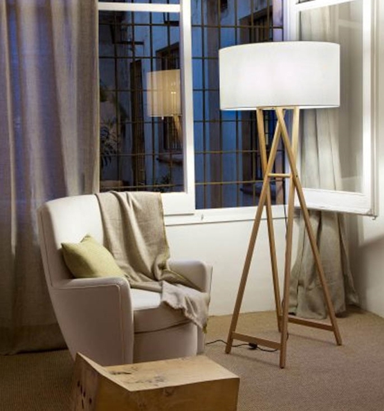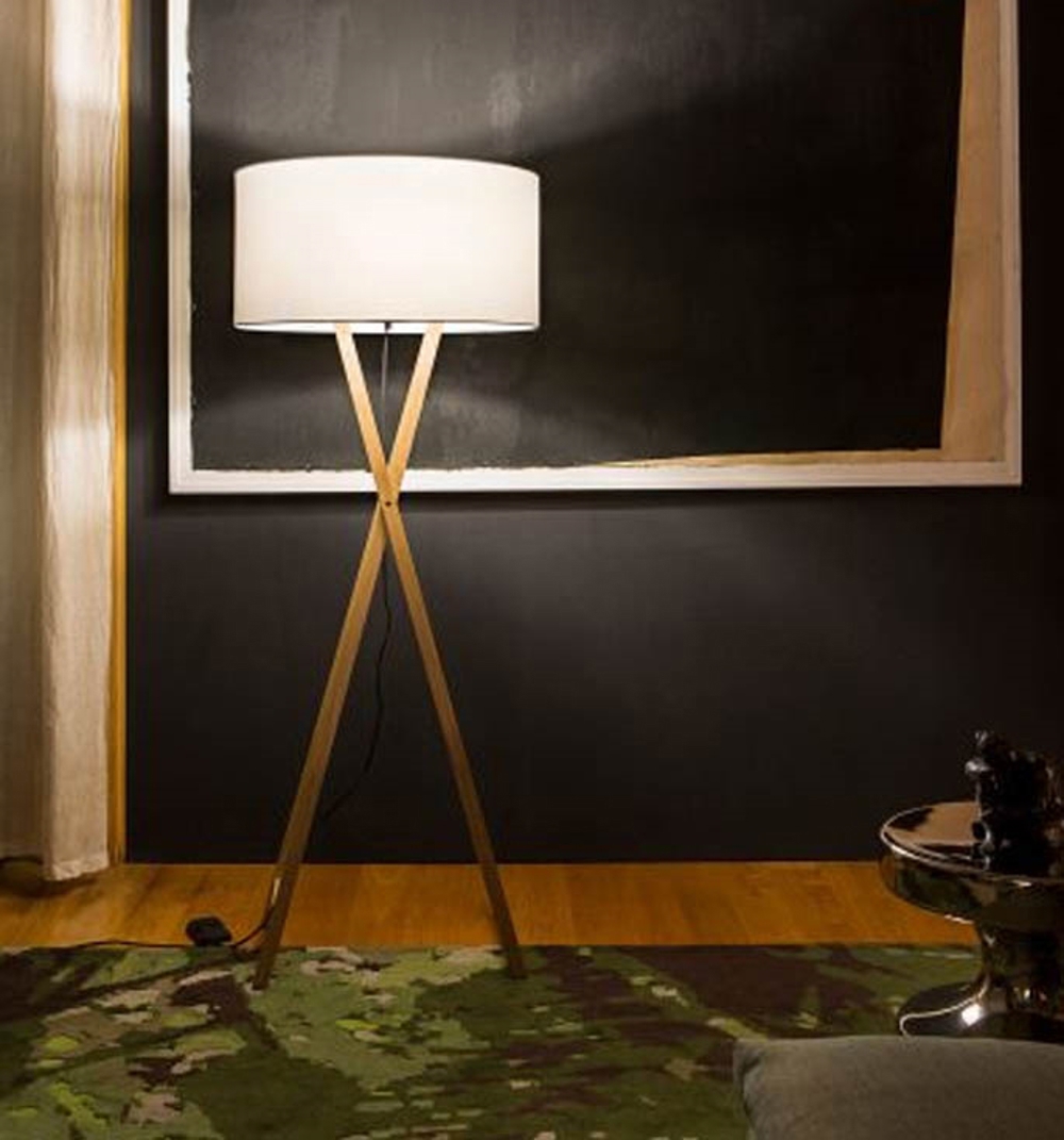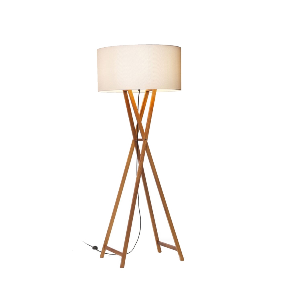 Gulvlampen har en hvid skærm, og stel af egetræ.