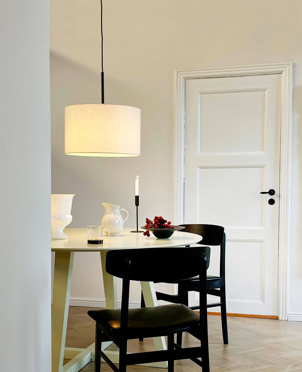 Pendlen Calix med lav lampeskærm er stilrent dansk design med et moderne nordisk udtryk. Lampens stofskærm med diskret topplade sikrer en dæmpet og afbalanceret belysning med et blødt og behageligt lys. Perfekt som belysning over spisebordet eller pendel i stue, soveværelse eller ethvert andet rum, hvor den vil bidrage til en varm og indbydende atmosfære.