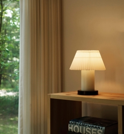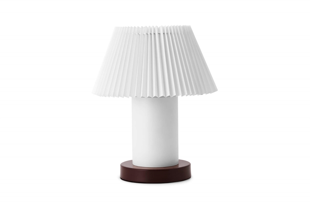 Cellu bordlampen har en klassisk foldet lampeskærm og fremstår med et moderne udtryk. Skærmen er i PVC og hviler på en pulverlakeret aluminiums fod og pulverlakeret stål base.