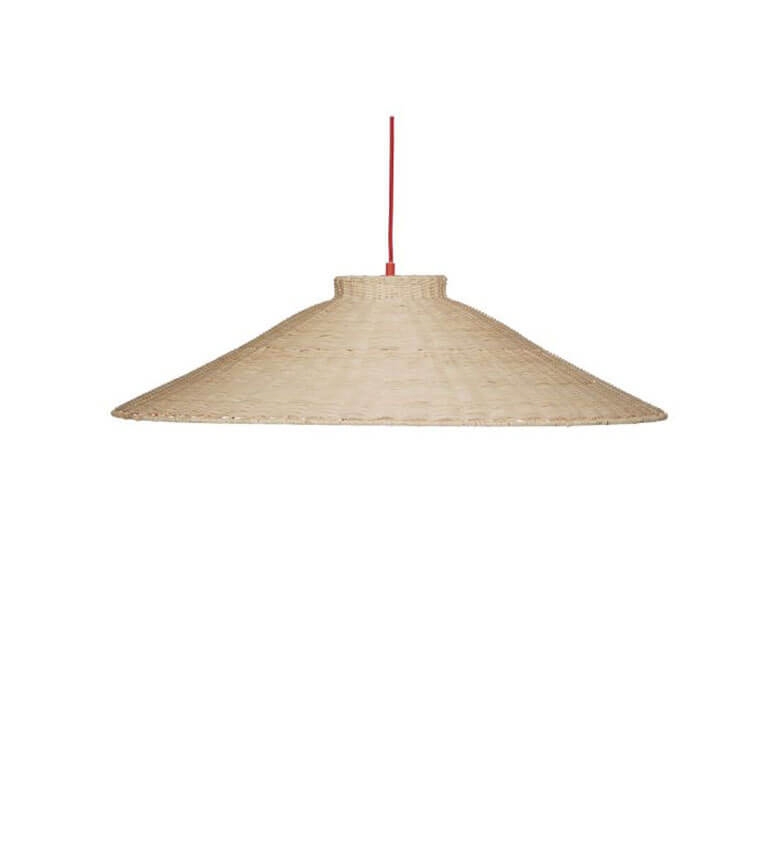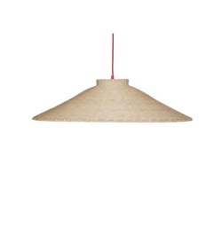 Denne flotte pendel giver et meget naturligt samt roligt udtryk, dog giver den røde ledning lampen et frisk pust. Lyset fremstår virkelig behageligt grundet skærmens flettede struktur. Pendlen har en flot trapez form, der giver et bredt lysspektrum, der både er flot over sofabordet men også sagtens kan bruges i soveværelset.