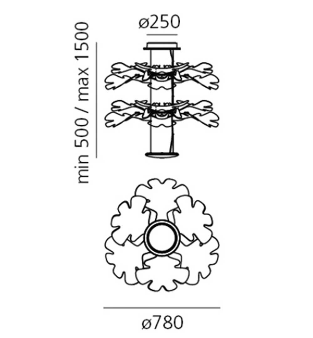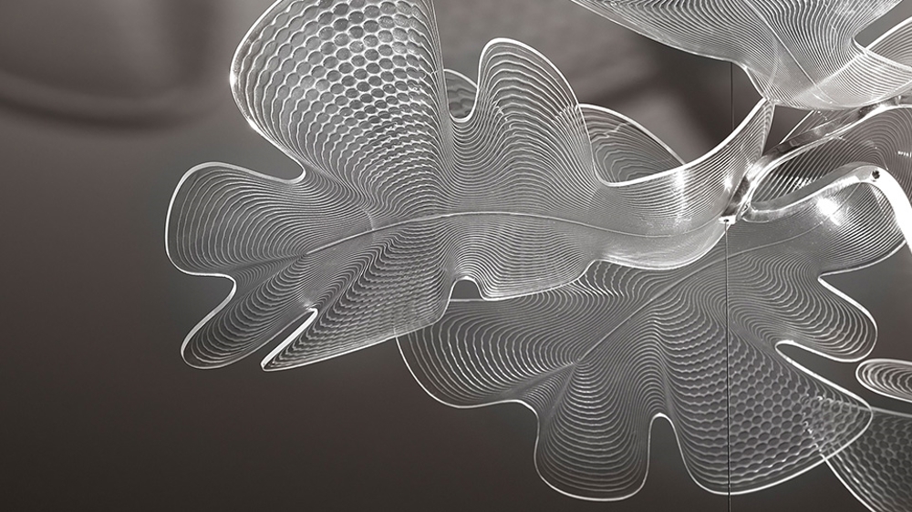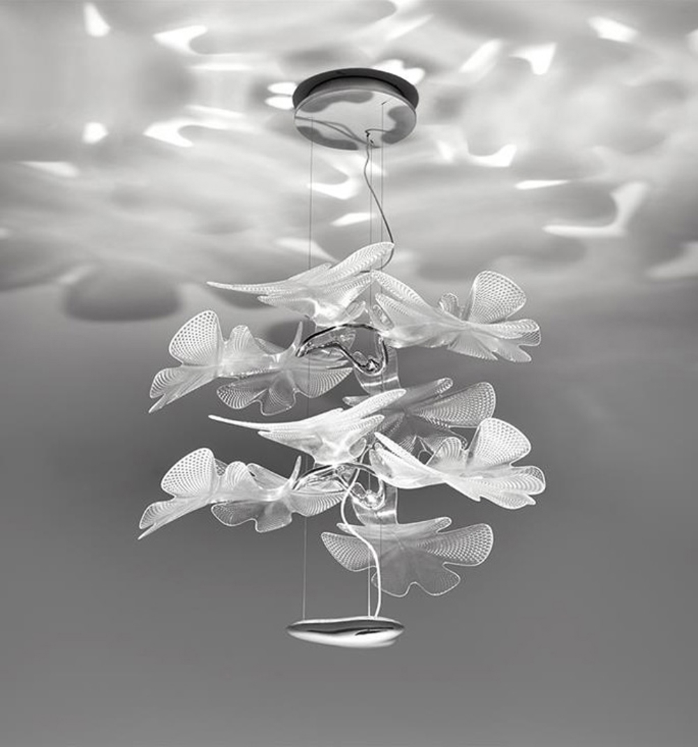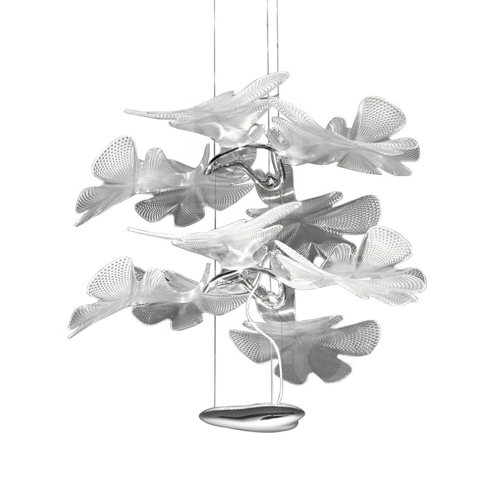 Smuk pendel med stel i aluminium og blade i transparent plastik. Pendlen understreger både Atremide og Ross Lovegroves utrolige evner til at designe belysning, som er nytænkende og organisk i dets form.