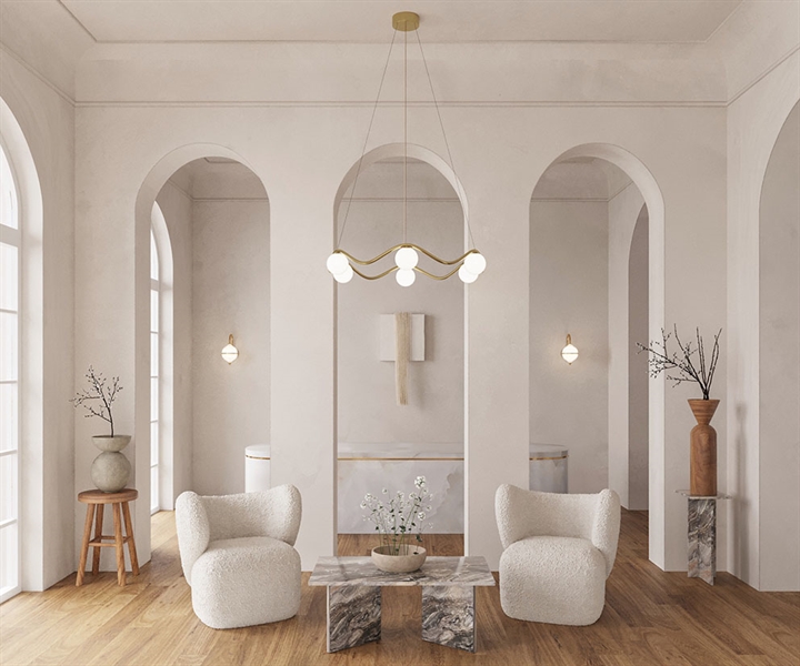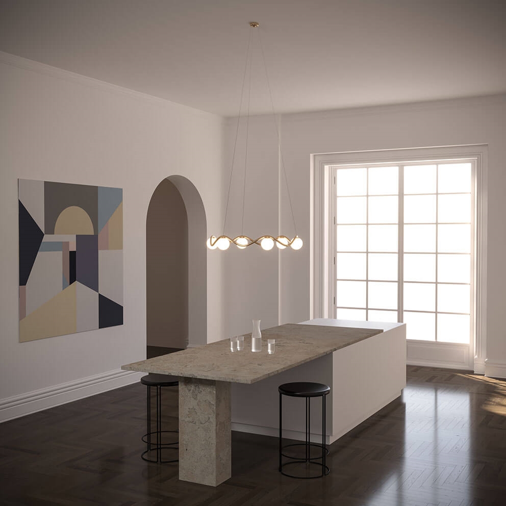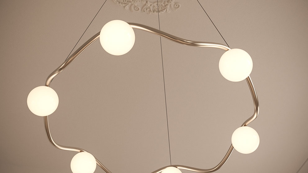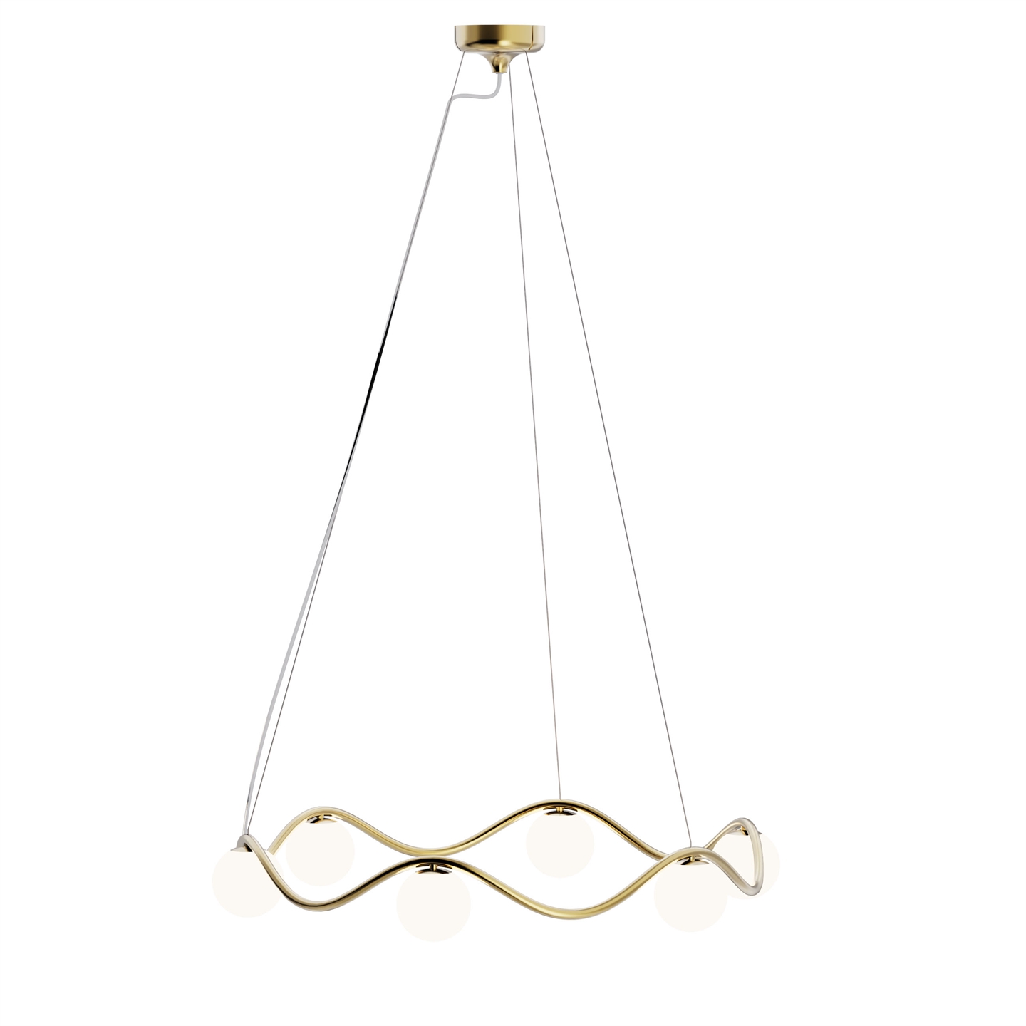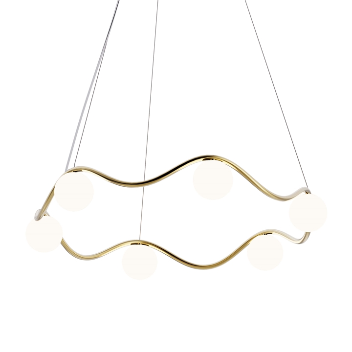 Lysekronen Circle of Life er raffineret skandinavisk minimalisme med et elegant udtryk inspireret af livets op- og nedture. Den skulpturelle ramme i håndlavet poleret messing har organiske kurver og seks mundblæste kugleskærme i opalglas. Den store lysekrone udsender et blødt lys og vil gøre sig godt som belysning over spisebordet eller som midtpunkt i stuen, køkkenet eller entréen.
