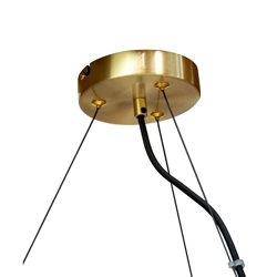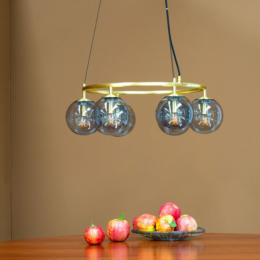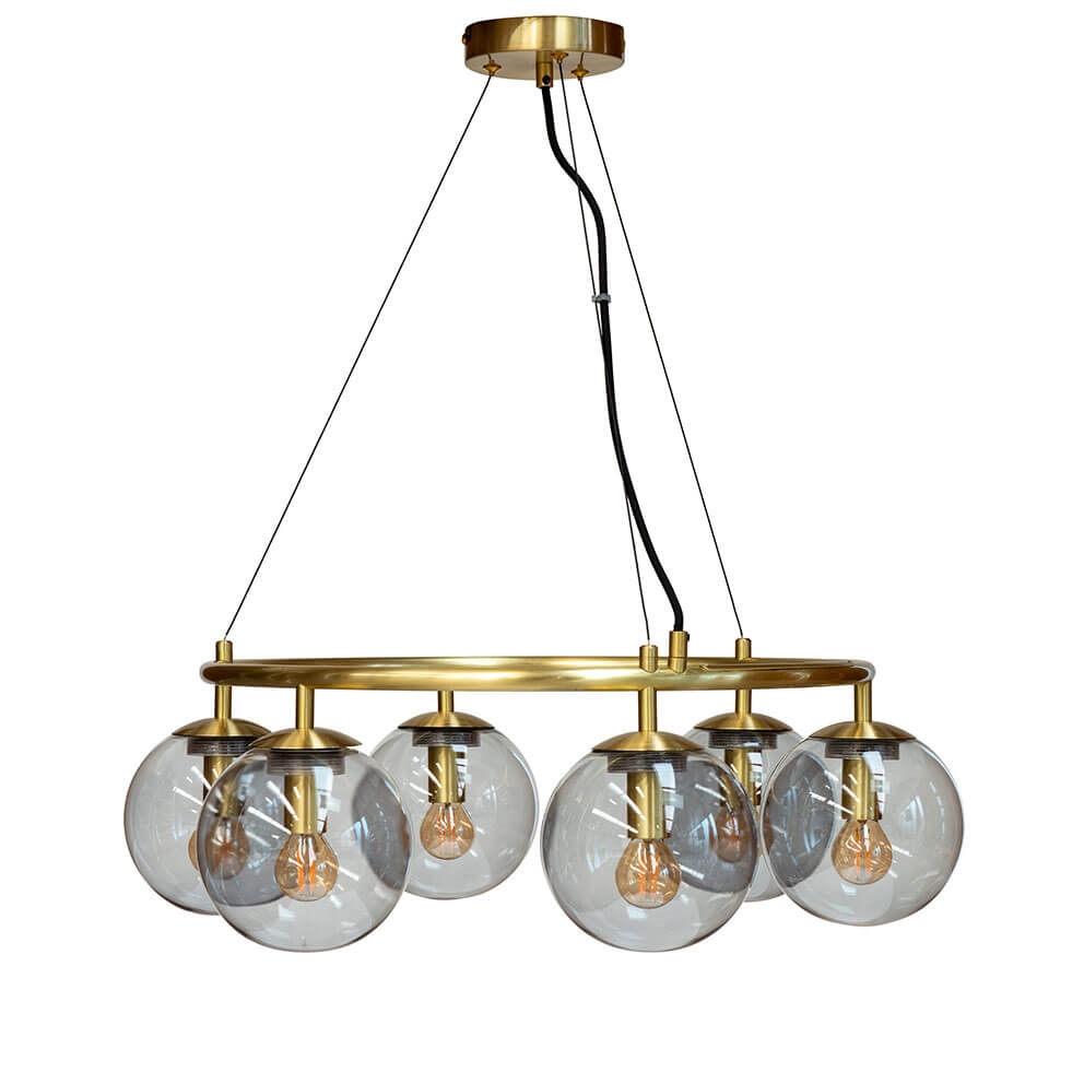 Como lysekronen med seks glaskupler i tonen smoke og design i messing passer godt som belysning over spisebordet. Lysekronen giver et behageligt lys og er samtidig med sit design et markant element i din indretning. Lampen hænges fra den medfølgende roset i messing i tre wirer og har samlet et stilfuldt og elegant udseende.