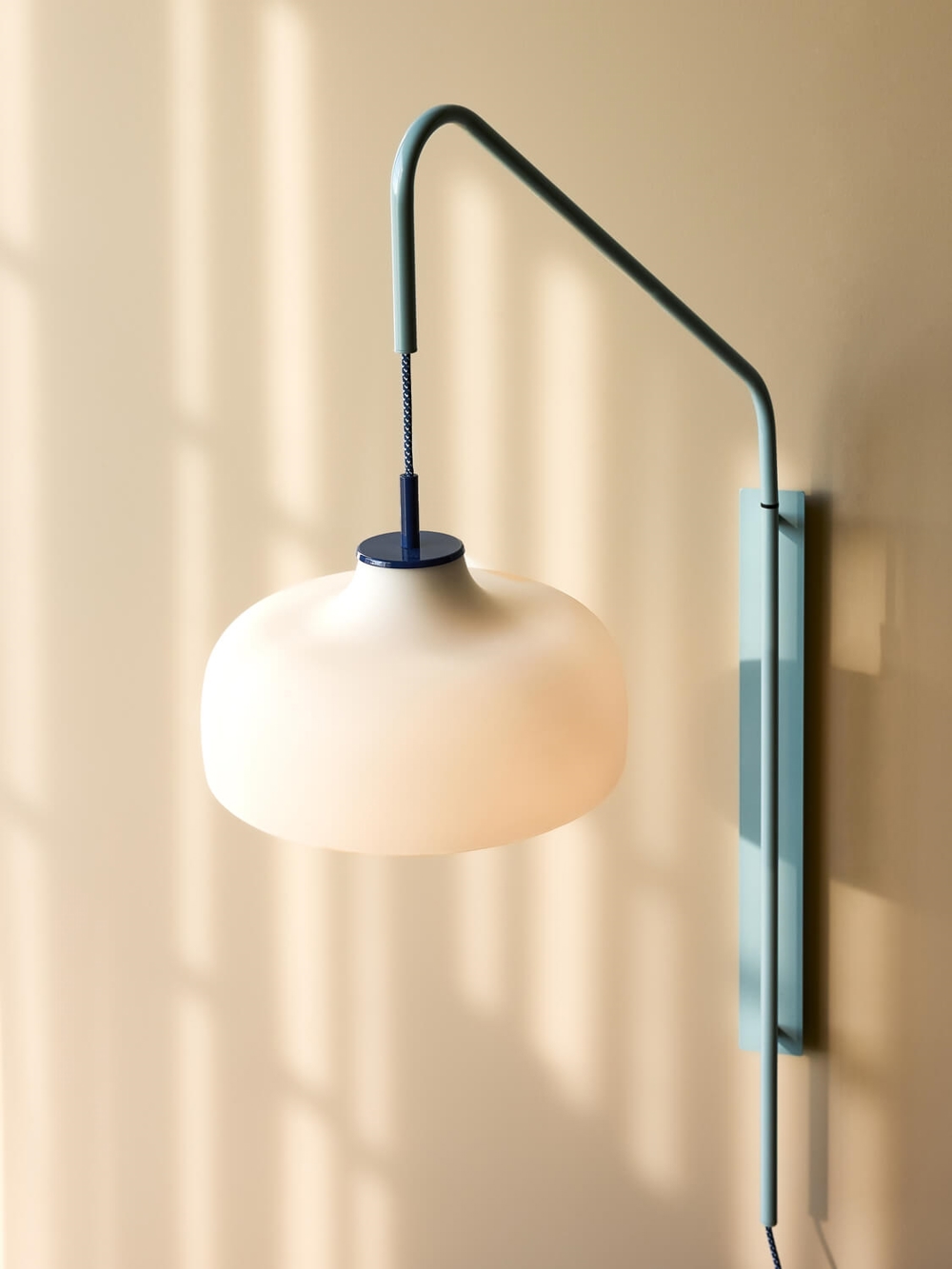 Current væglampen består af en blå base og en hvid opal skærm lavet i glas.
