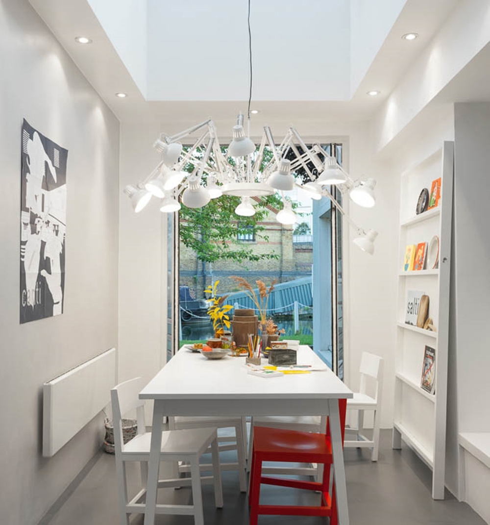 Pendlen består af 16 arkitektlamper monteret på samme armatur - og bliver på denne måde en nymoderne variant af den klassiske lysekrone - med udtrykket af en edderkop.