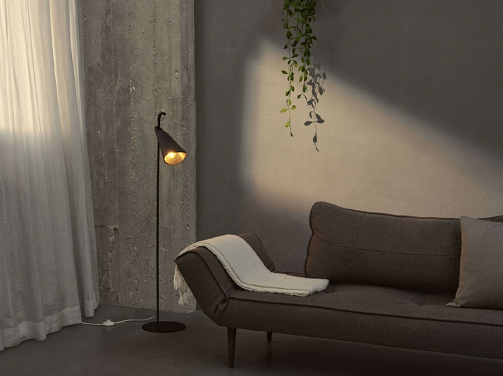 Den tidløse gulvlampe Decor Bell i sort fremstillet i stål med skærm i genanvendt polyethylen er et oplagt valg som læselys ved lænestolen i stuen. Skærmens position kan ændres. Gulvlampen kan med fordel kombineres med andre lamper i Decor Bell-serien for at skabe en helhed i indretningen.