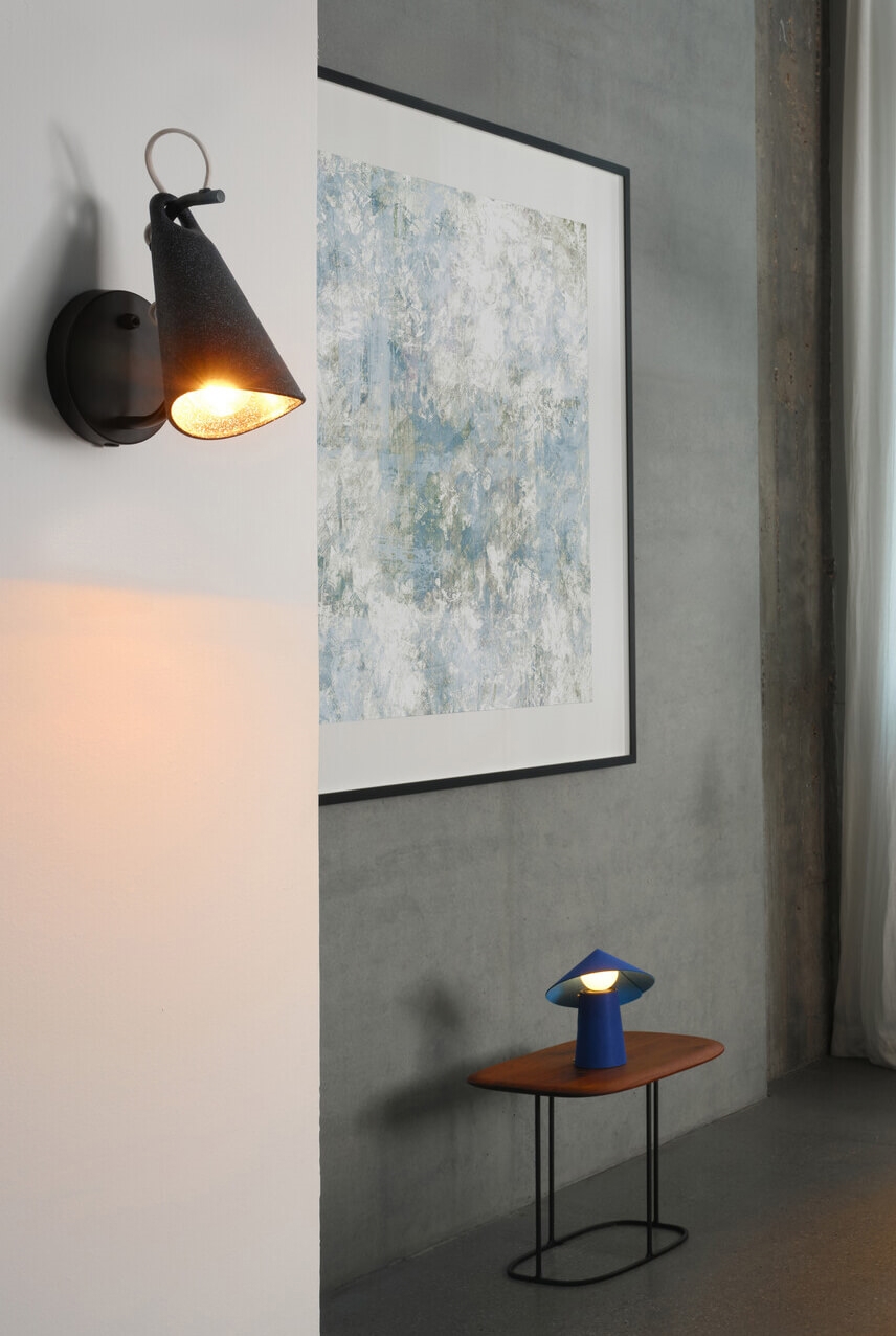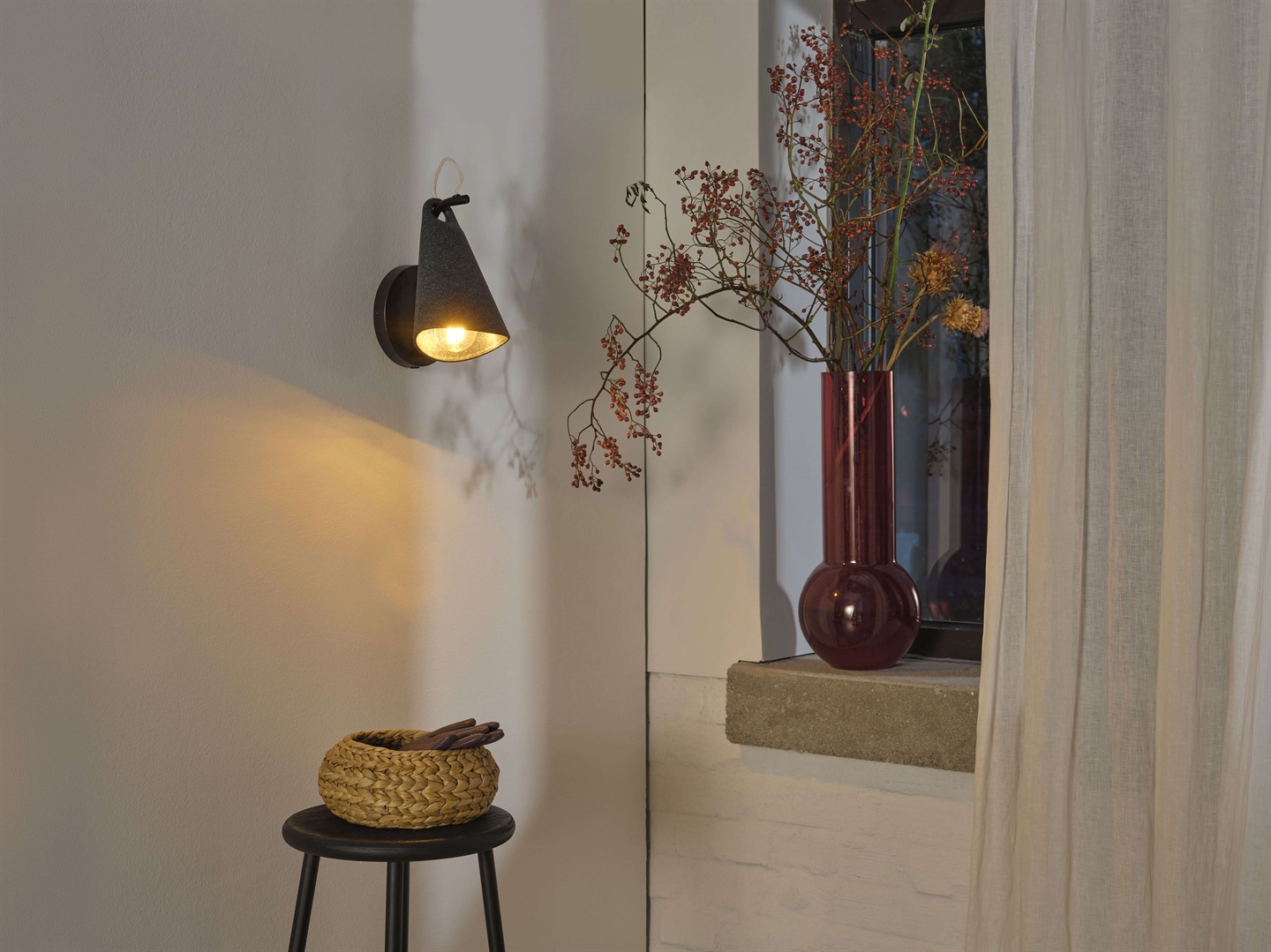 Den tidløse væglampe Decor Bell i sort fremstillet i stål med skærm i genanvendt polyethylen er et oplagt valg som læselys ved lænestolen i stuen eller ved sengen i soveværelset. Skærmens position kan ændres.