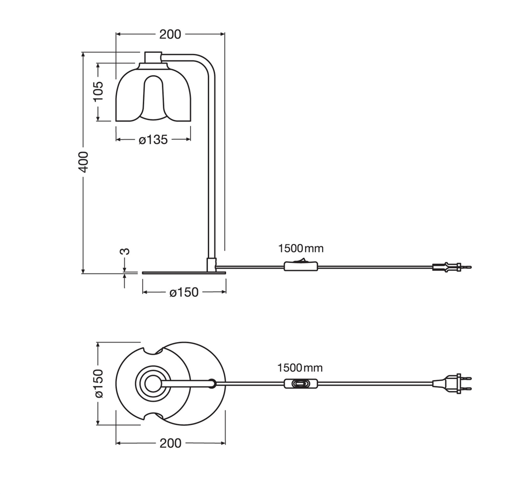 Mål: H40 x D20 cm, base: Ø15 cm, skærm: Ø13,5 x H10,5 cm