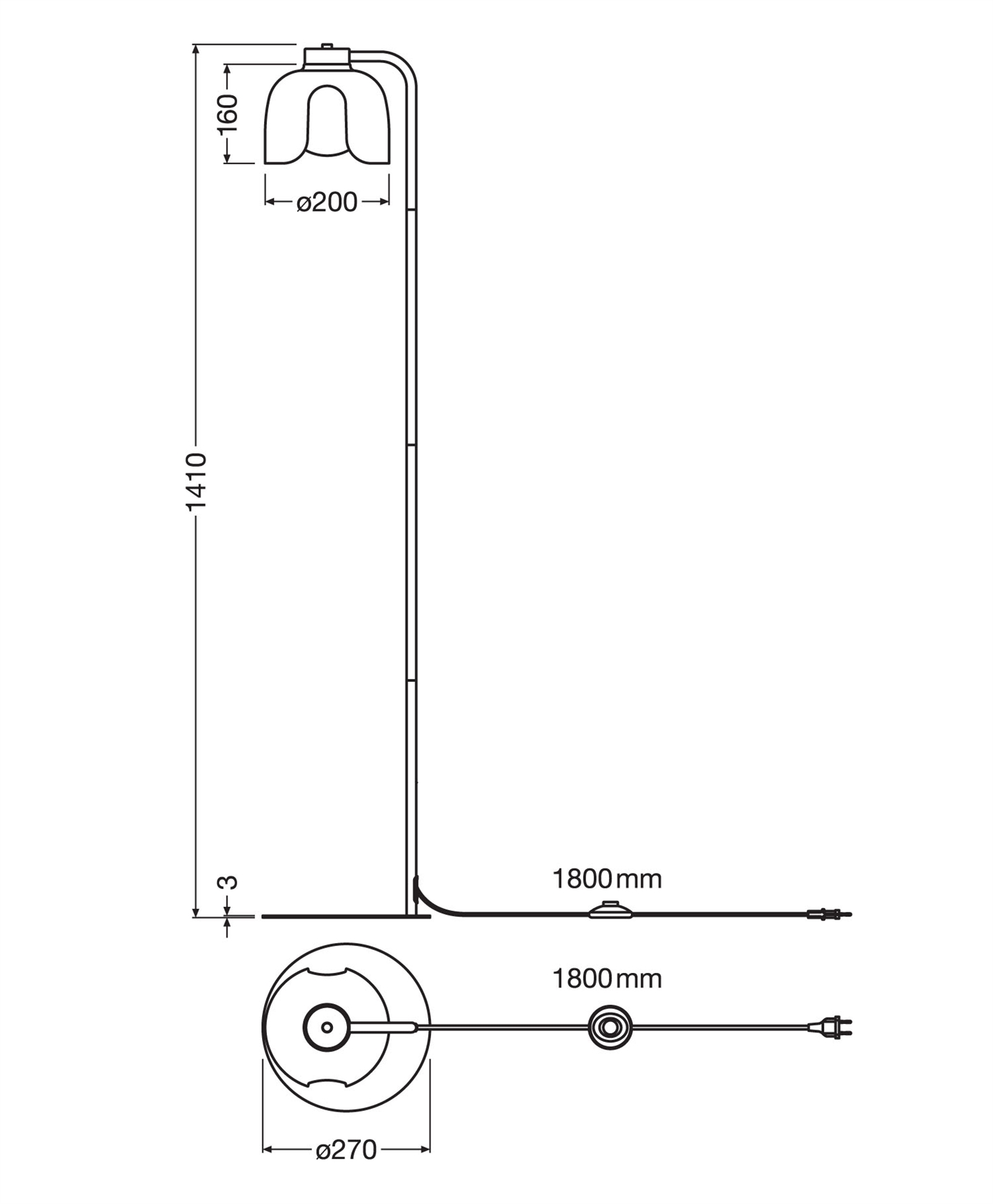 Mål: H141 cm, base: Ø27 cm, skærm: Ø20 x H16 cm