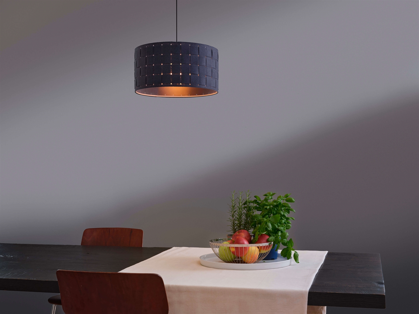 Decor Felt Weaving 380 har en E27-fatning, hvilket giver frihed til at vælge lyskilde efter eget ønske til lysstyrke og farvetemperatur. Den åbne konstruktion sikrer en jævn lysfordeling, mens filten filtrerer lyset og dæmper blænding og hårde kontraster.