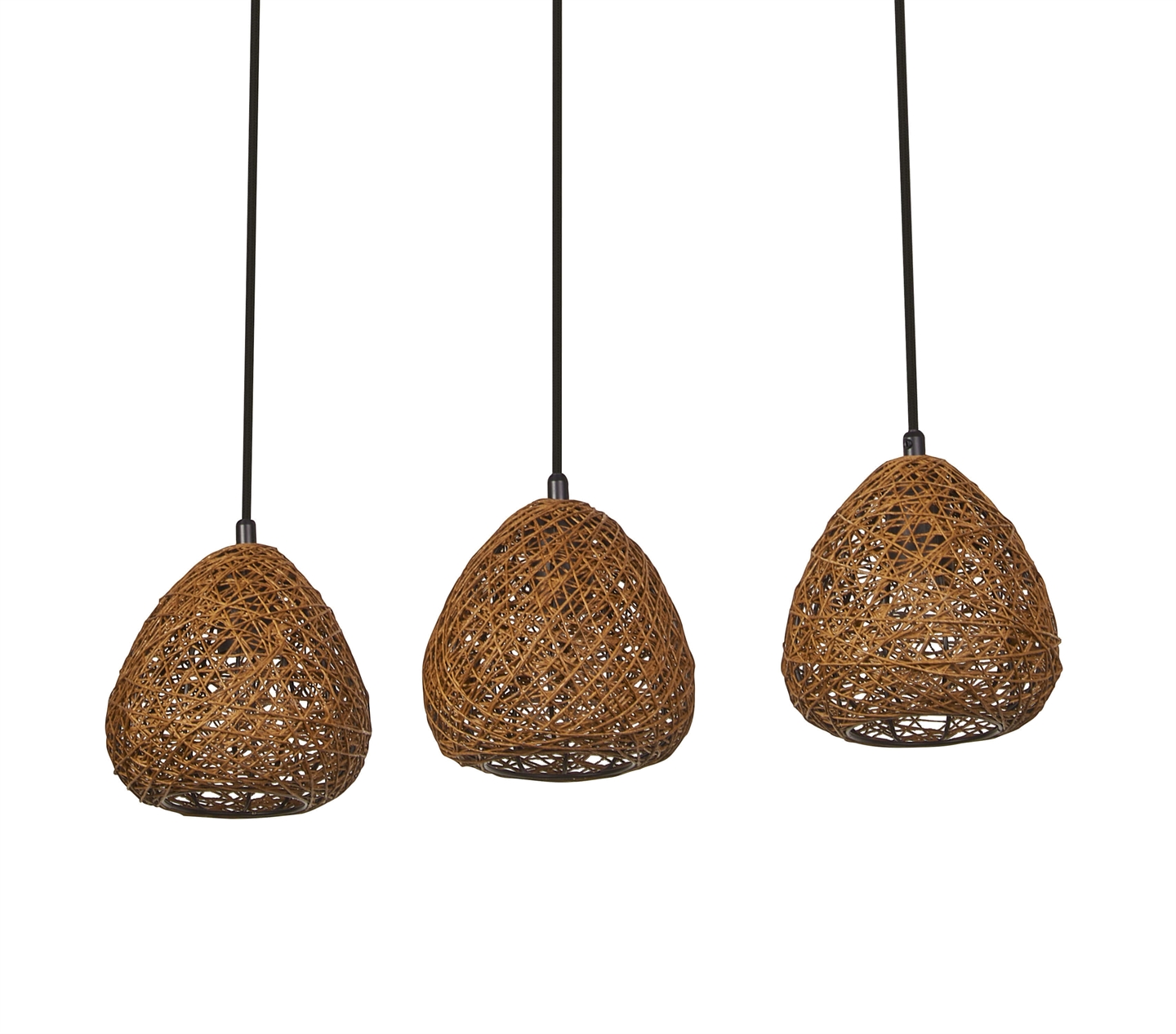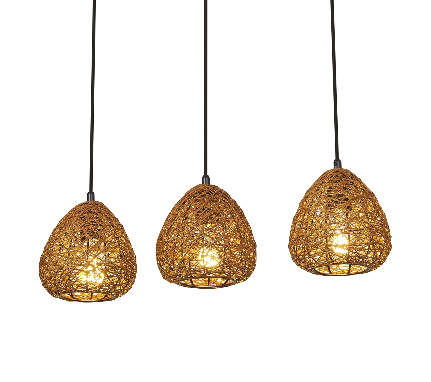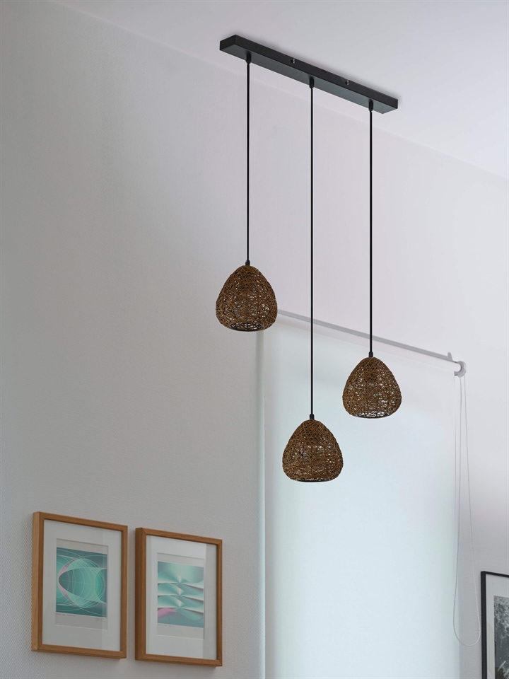 Klyngependlen Decor Paper Drop Linear tilfører rummet en let og stemningsfuld elegance med sine naturlige materialer og bløde former. De tre lampeskærme hænger smukt på række og er fremstillet af tyndt papir i en varm beige nuance, som filtrerer lyset på en behagelig måde og skaber en indbydende atmosfære i rummet.