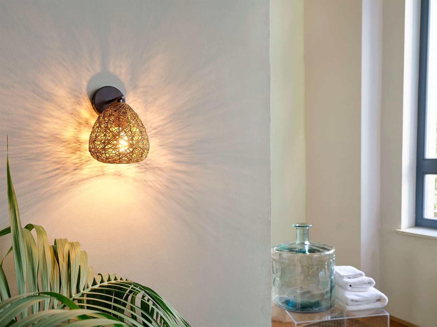 Væglampen Decor Paper Drop tilfører rummet en let og stemningsfuld elegance med sine naturlige materialer og bløde former. Lampeskærmen er fremstillet af tyndt papir i en varm beige nuance, som filtrerer lyset på en behagelig måde og skaber en indbydende atmosfære i rummet.