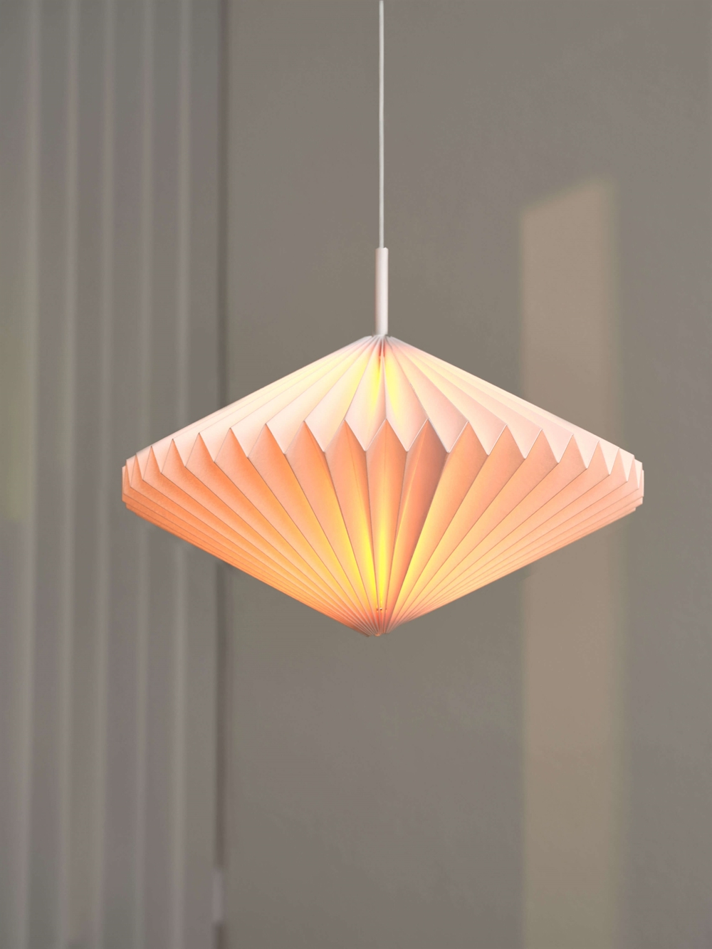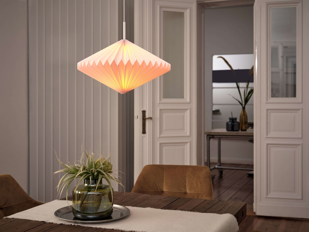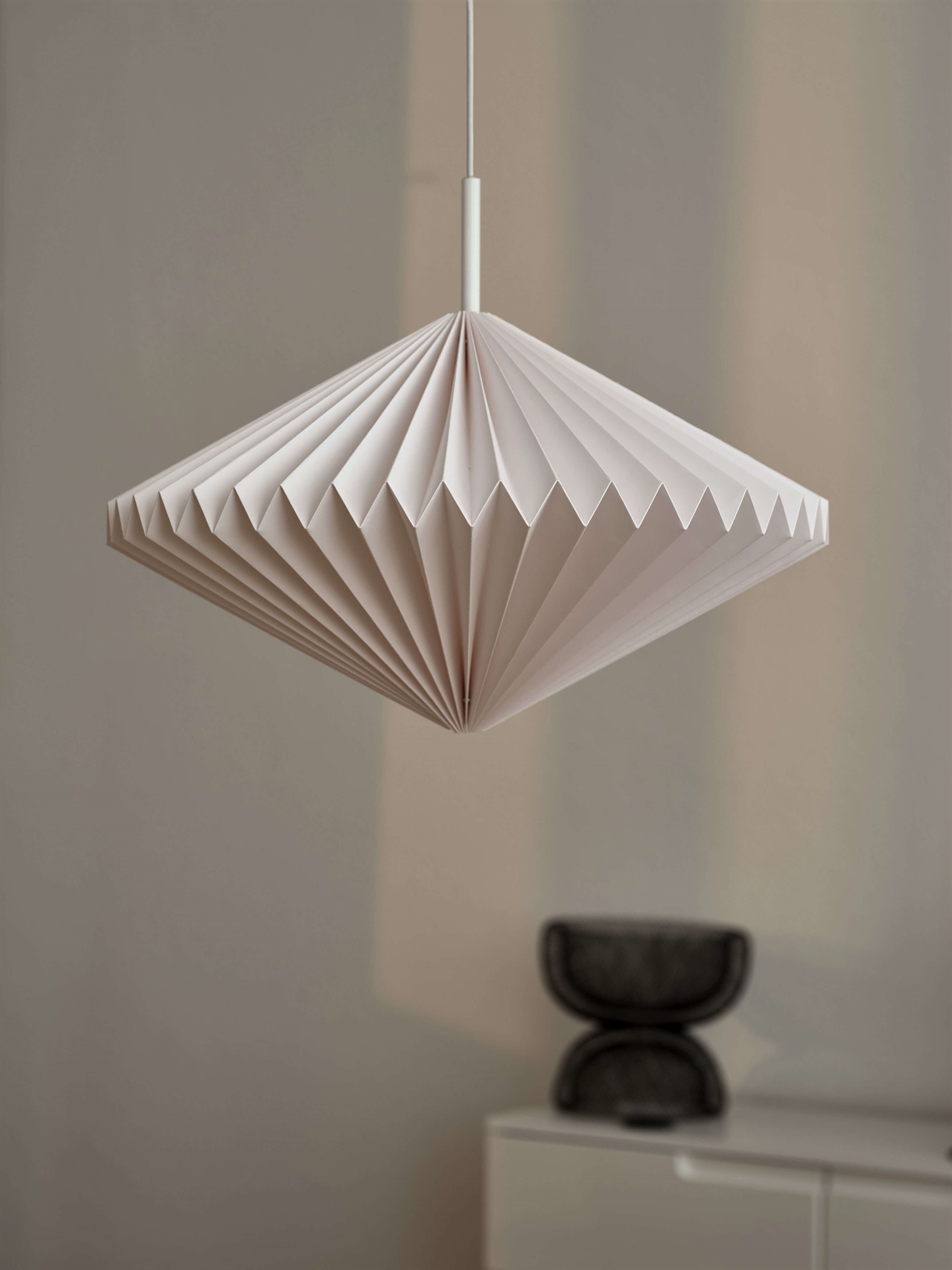 Pendlen Decor Paper Lantern Diamond af tyndt foldbart papir og stål har et varmt og behageligt lys. Benyt den dekorative lampe i opholds- og soverum eller som belysning i børneværelset, entréen og gangen eller ved en trappe.