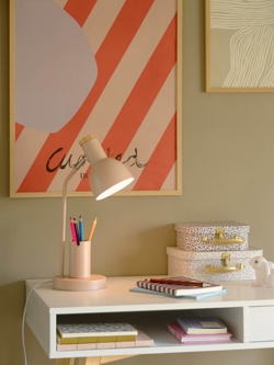 Bordlampen Devone med indbygget opbevaring til blyanter eller holder til en telefon er den perfekte skrivebordslampe til børneværelset. Med et cool mix af metal og FSC-certificeret træ har Devone et flot design med et fleksibelt lampehoved, der kan vippes 150° og drejes 320°. Funktionel og praktisk lampe til skrivebordet med et godt læselys og smarte detaljer.
