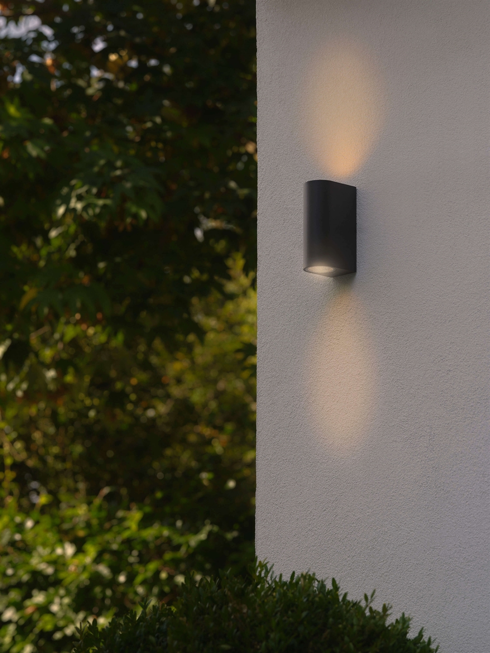 Den udendørs væglampe Dion double har et enkelt og moderne design, der med sit buede udtryk er både elegant og minimalistisk. Væglampen sender lyset både opad og nedad og er et godt valg til mange udemiljøer.