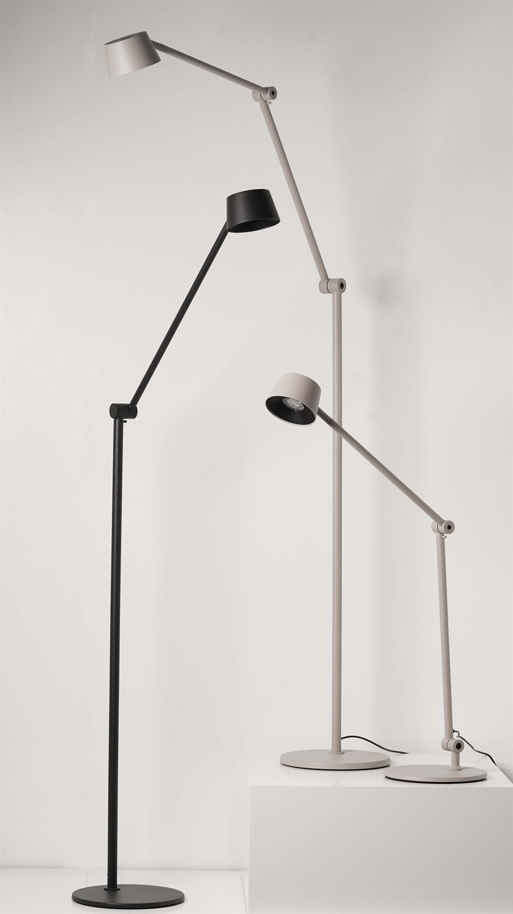 Det stramme formsprog med diskrete og gennemtænkte detaljer har et industrielt udtryk, der understreges af det synlige led og det slanke lampehoved.