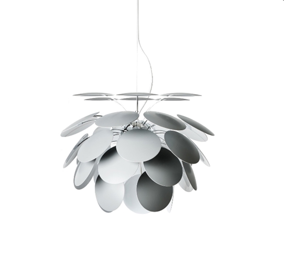 Discoco pendlen består af 35 cirkelskiver ABS-plastik, som grundet deres placering giver pendlen et let og elegant udtryk.