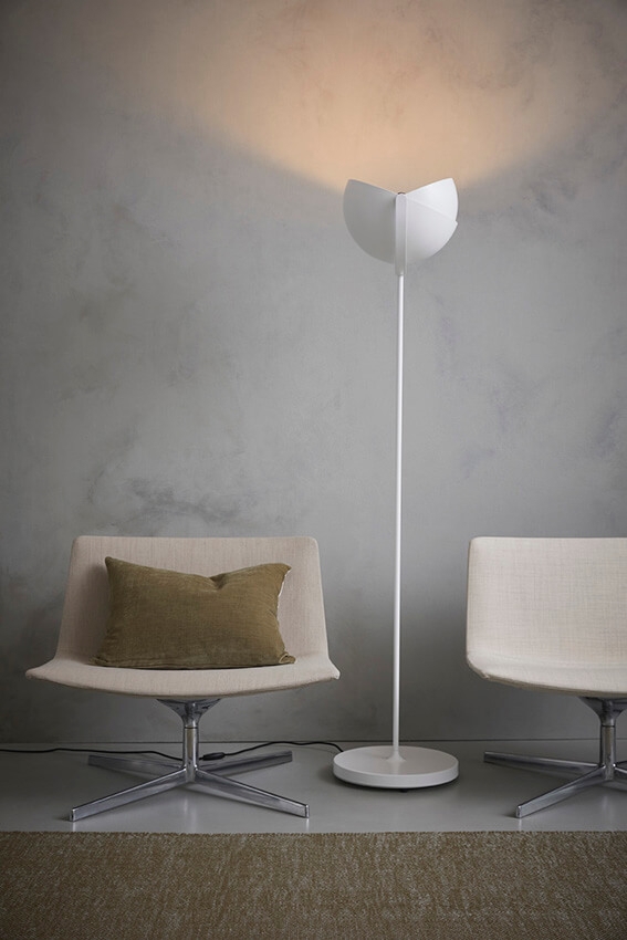 Gulvlampen findes i hvid og i sort og egner sig godt i stuen.