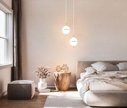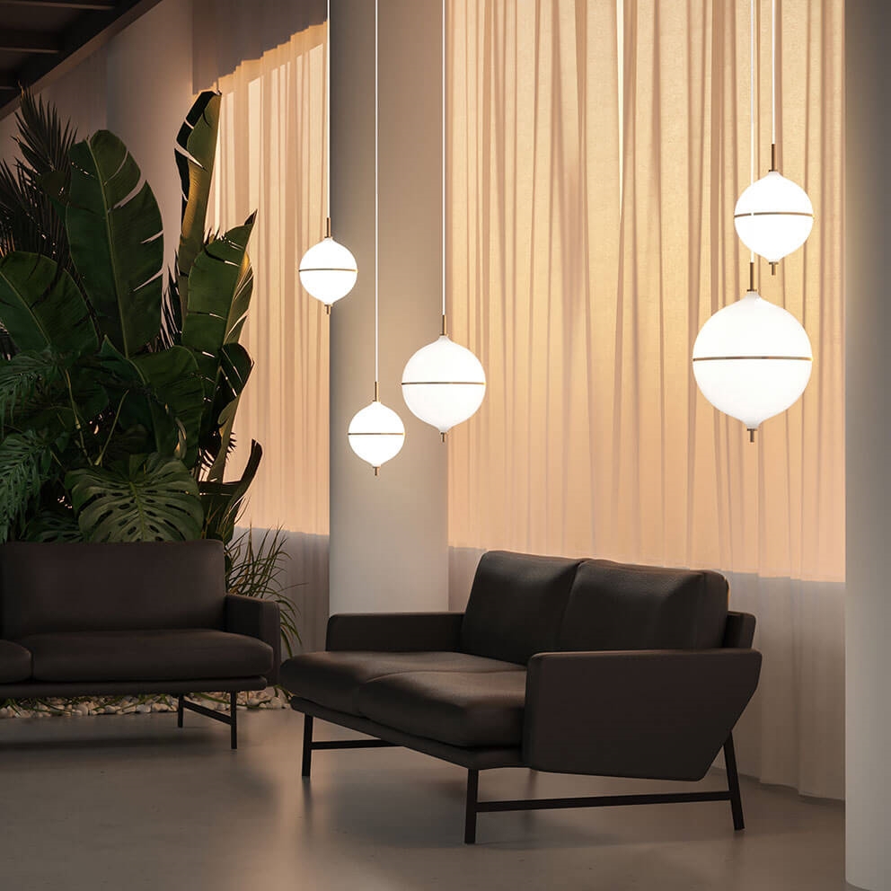 Pendlen findes i to størrelser med hvid eller sort ledning. Der er også væglamper i lampeserien.
