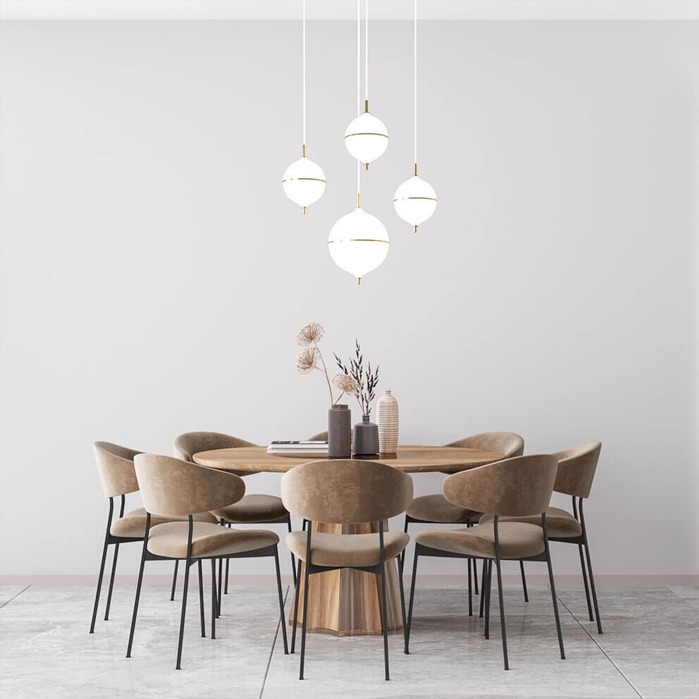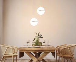 Designet er håndlavet i messing og opalglas og er en tidløs kombination af skandinavisk minimalisme og moderne elegance, hvor den hvide stofledning femhæver pendlens lyse og harmoniske udtryk. Et oplagt valg som belysning over spisebordet.